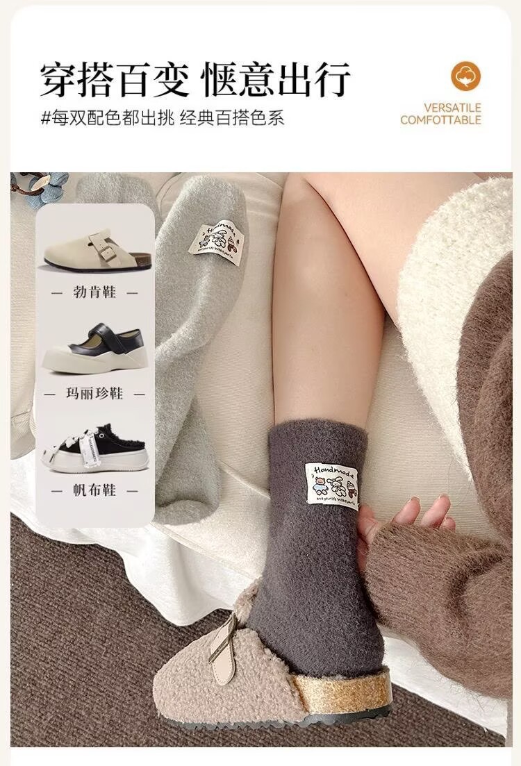 澳绒加厚保暖中筒袜子女可爱卡通kt布标撞色女士睡眠袜软糯月子袜