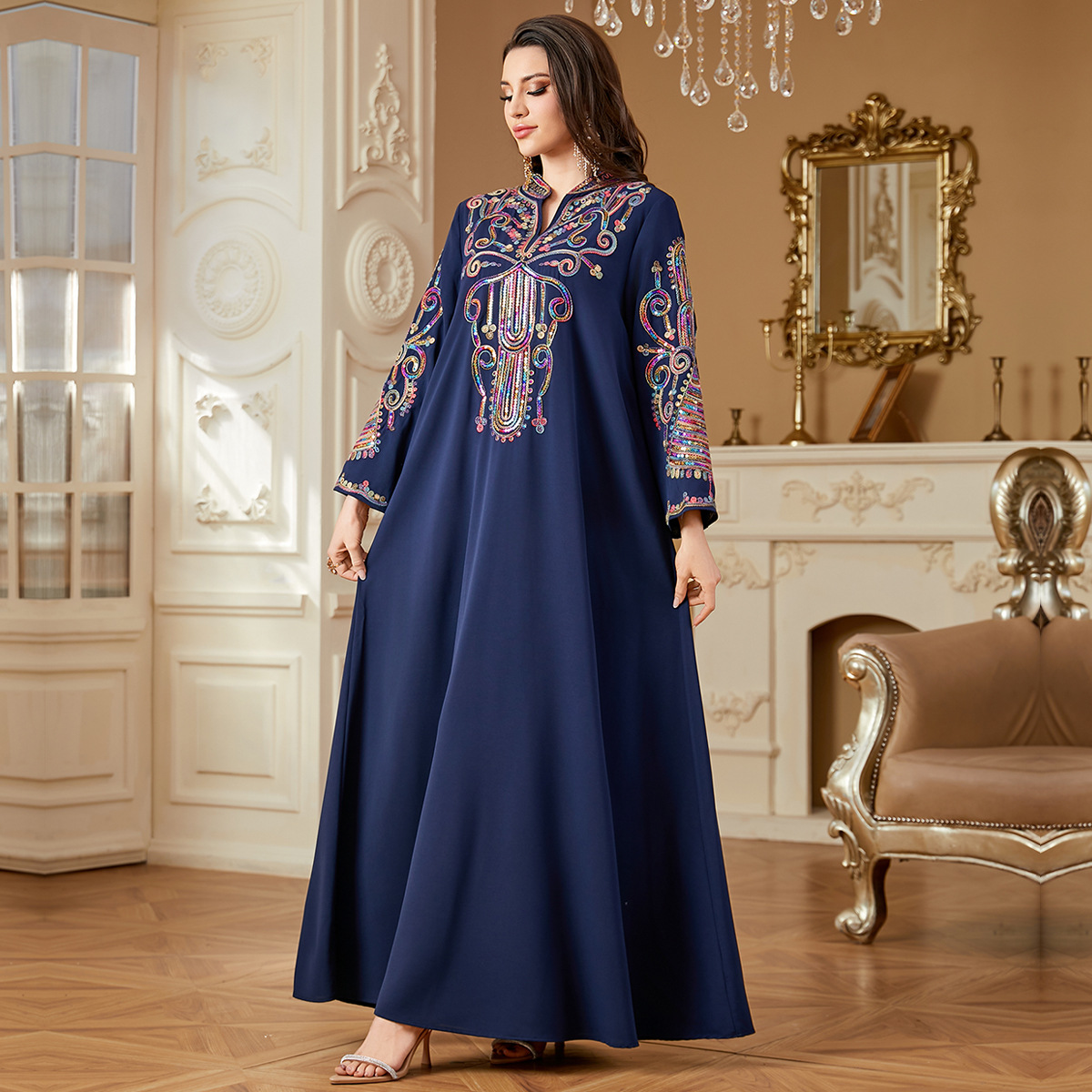 4065中東国境を越えたローブイスラム教徒刺繍vネックワンピースアラブドバイjalabiyaローブ