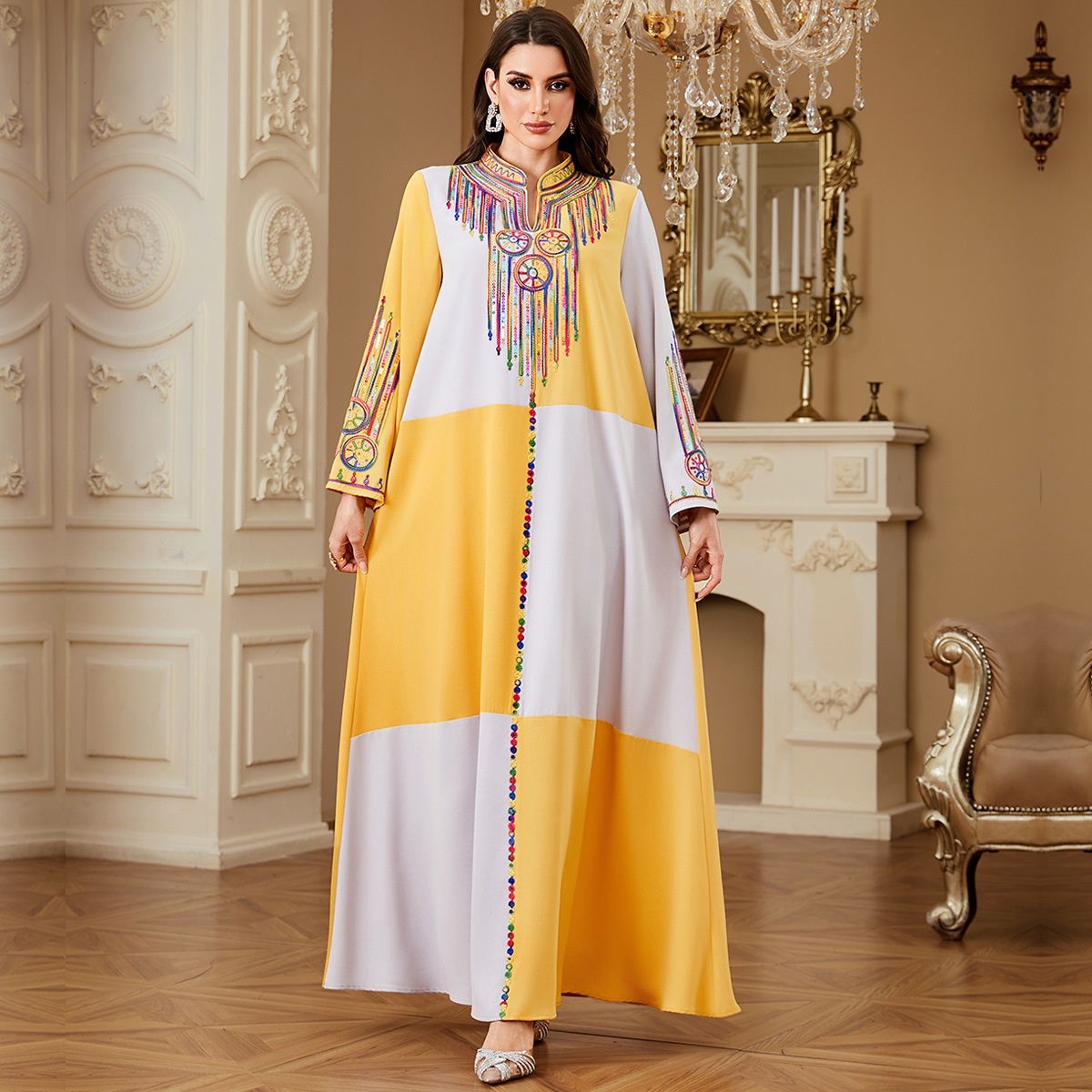 4385迪拜中东女装外贸阿拉伯女士长袍musilin拼接撞色刺绣连衣裙