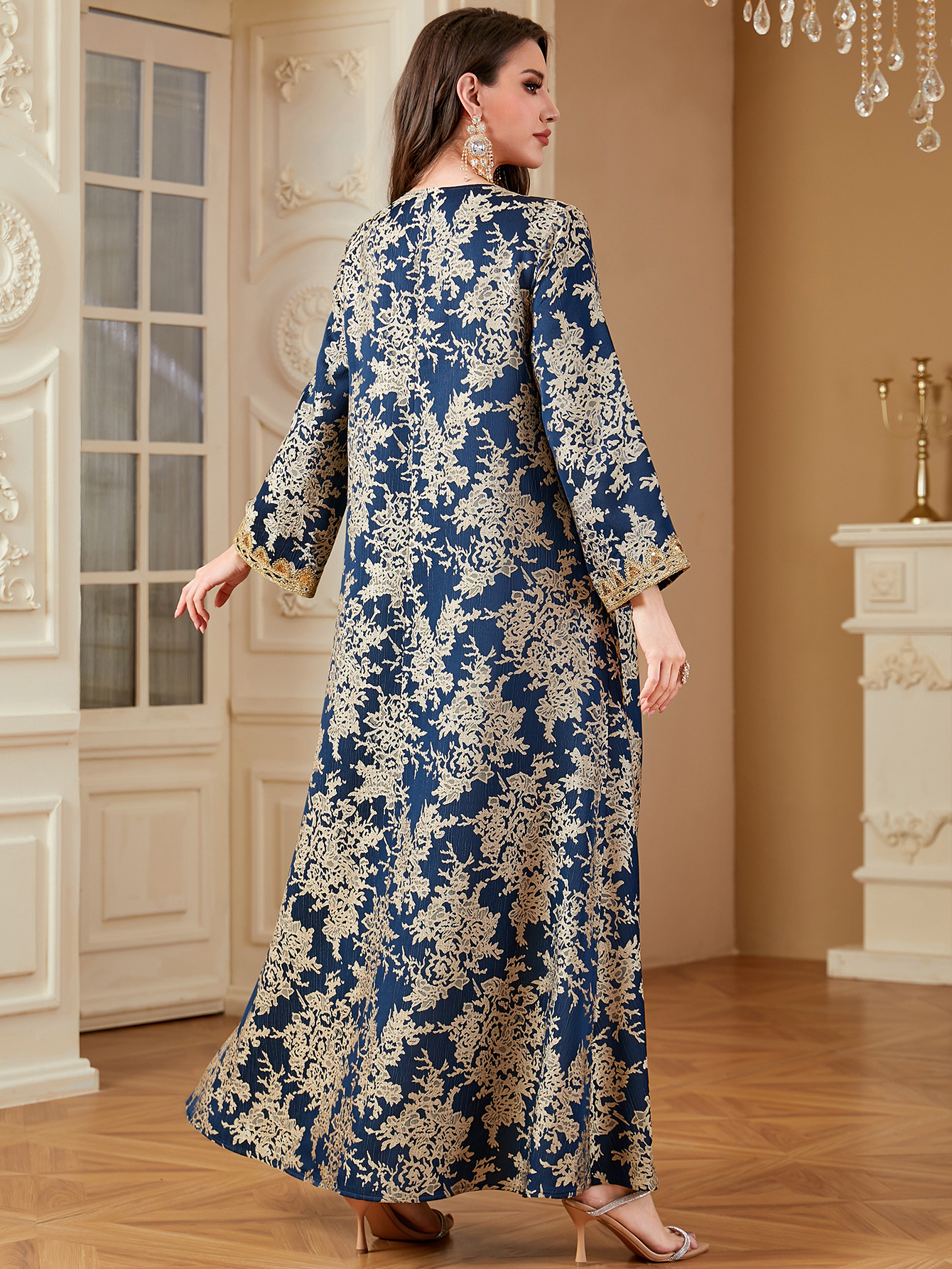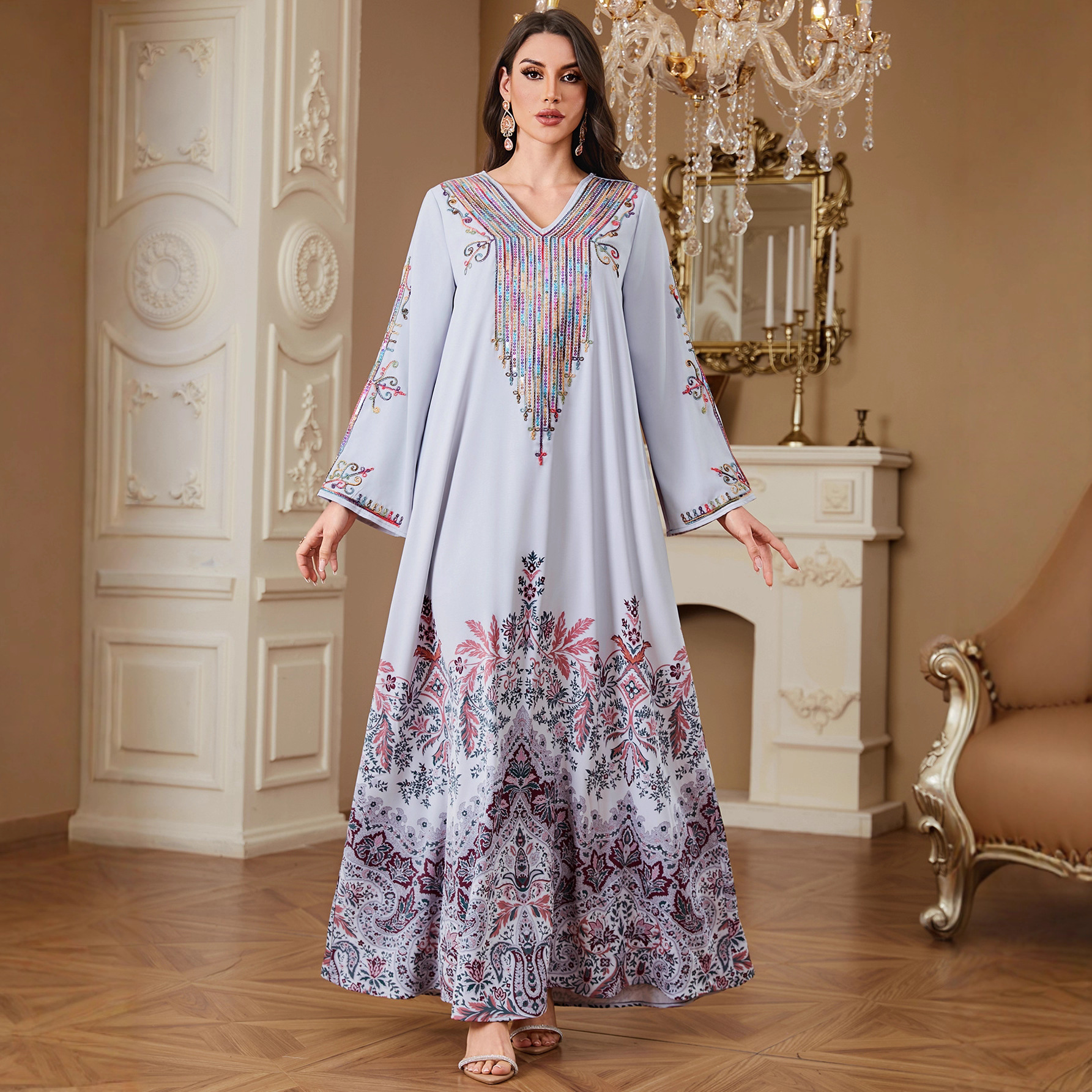 4394中东跨境女装四季优雅绳绣长袍女连衣裙迪拜服饰外贸印花长袍