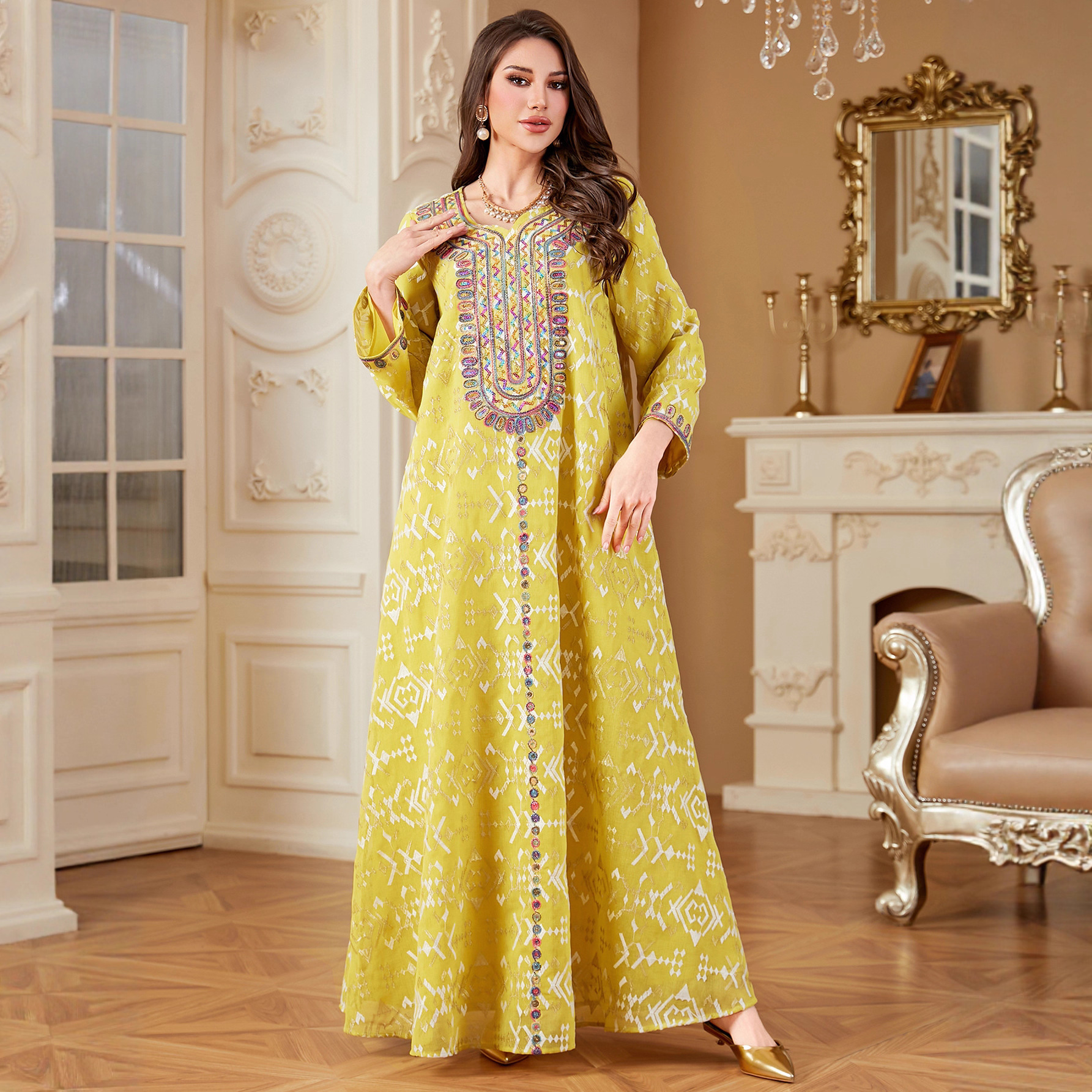 4476中东迪拜长袍女装跨境连衣裙子穆斯林烫钻印花阿拉伯袍子女裙