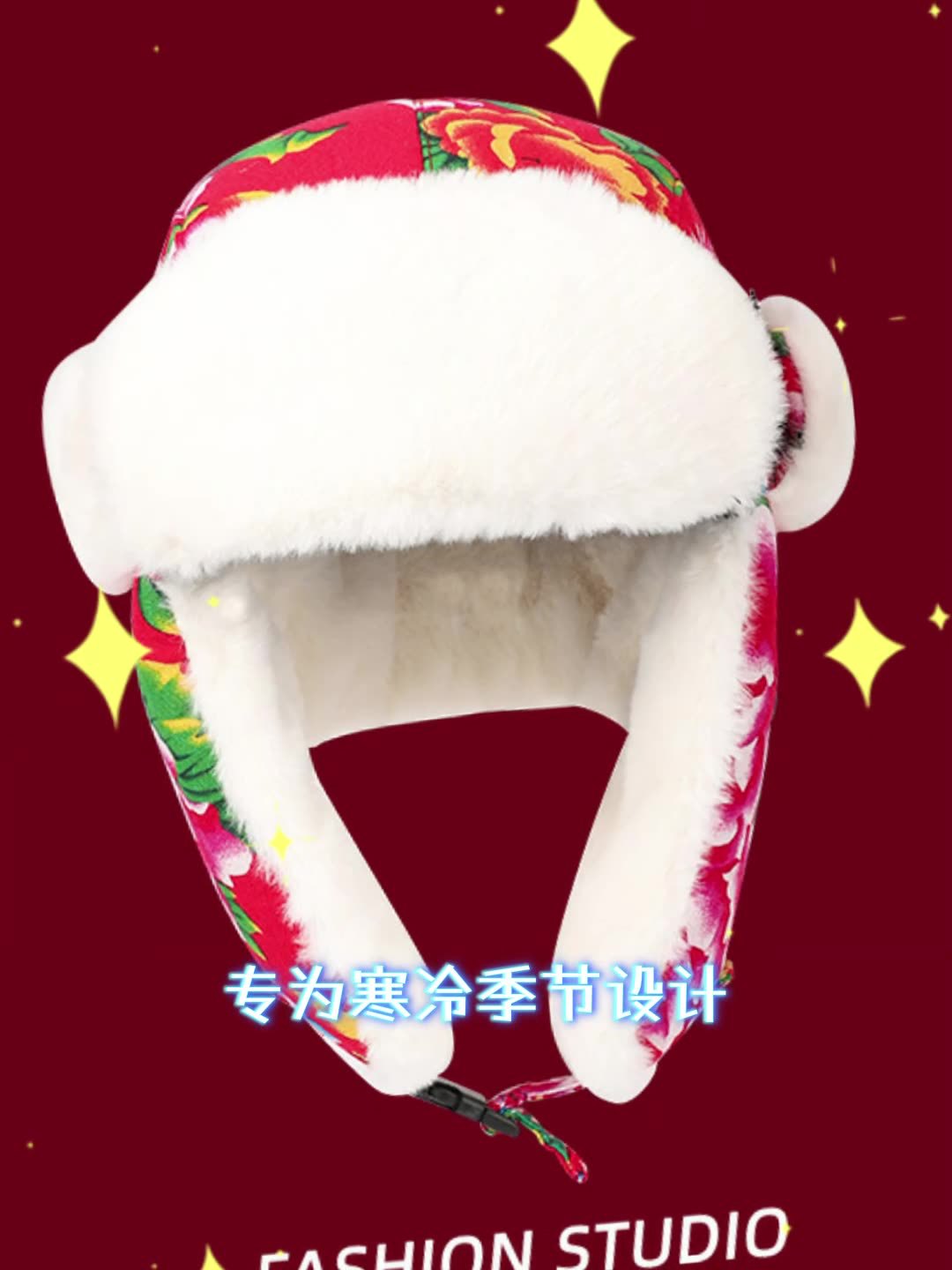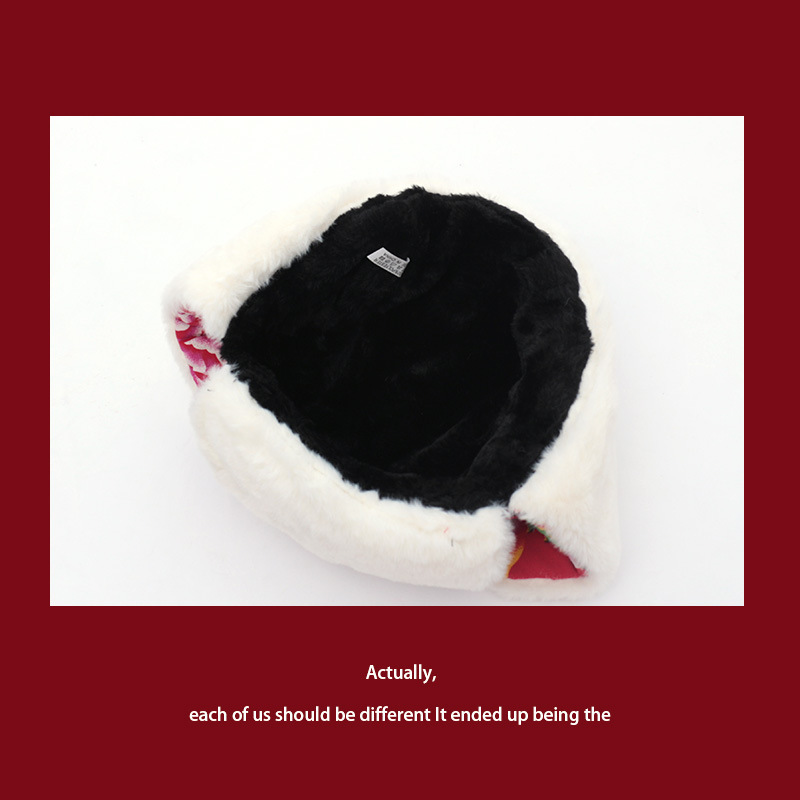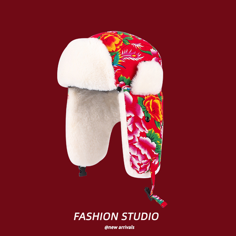 ハルビン冰雪祭りの女性用雷峰帽、冬用厚手保温スキー帽、東北風大花柄毛布防寒綿帽子