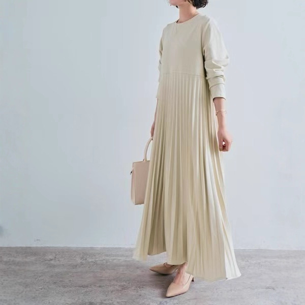 2025秋装圆领长袖松弛压褶下摆连衣裙 现货
