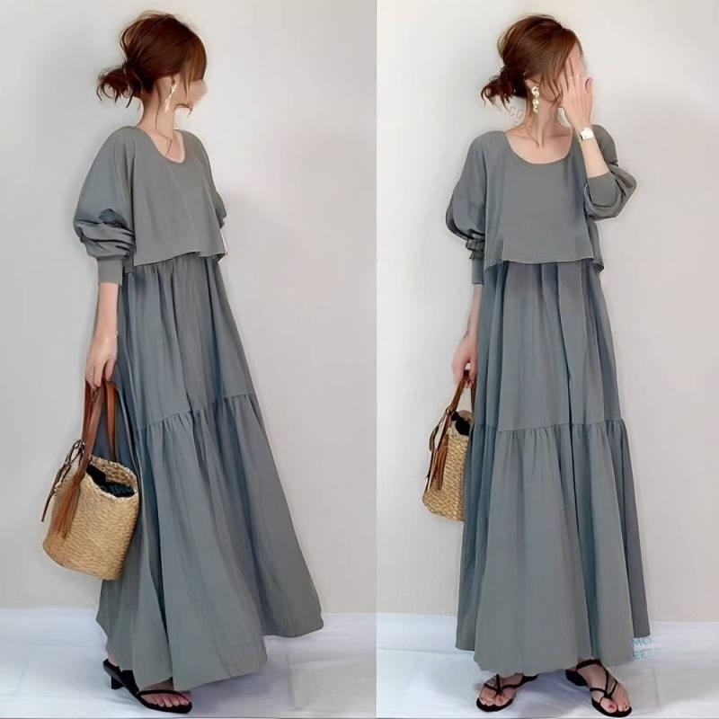 日系2025秋装新款圆领假两件长袖A摆连衣裙