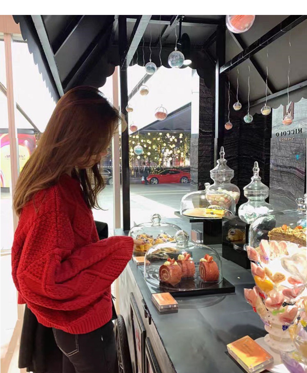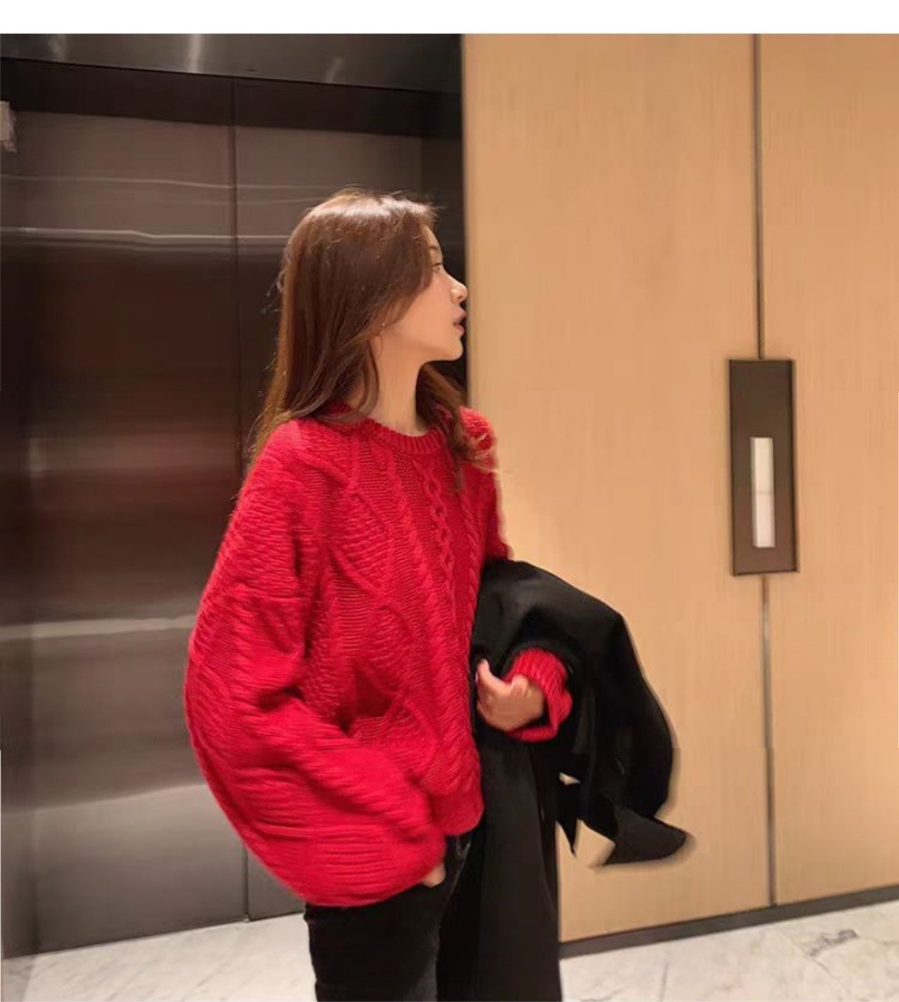 25欧货重工扭花纯羊毛衫女秋冬花纱宽松慵懒加厚新年红色毛衣