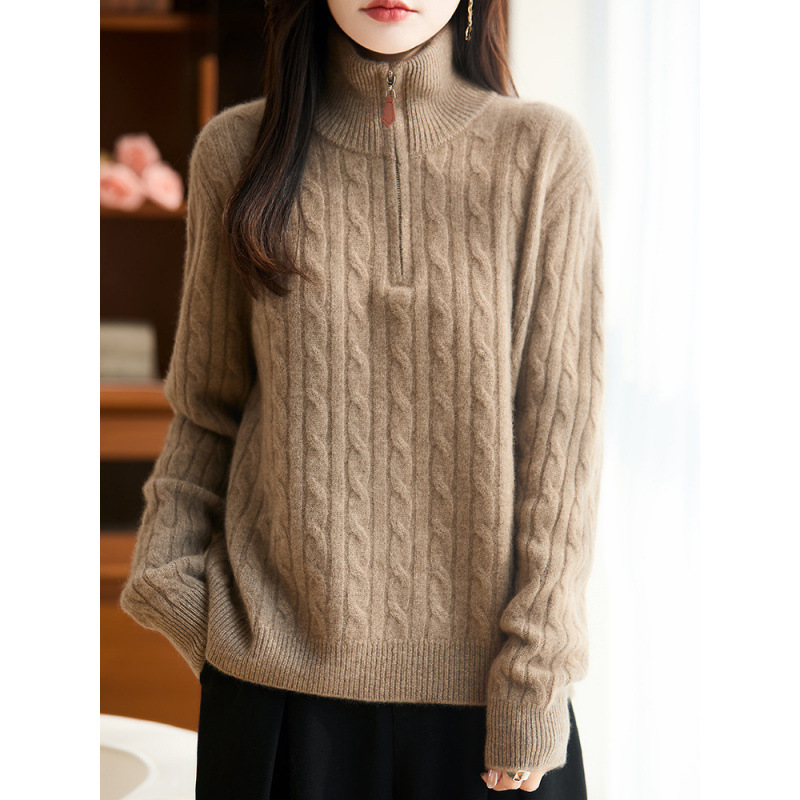 25秋冬新款纯羊毛高领半拉链针织衫长袖扭花宽松羊毛打底衫上衣女