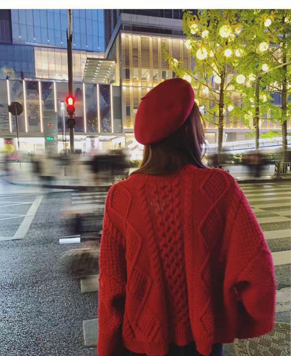韩系心机红100羊毛女秋冬挂脖圆领长袖开衫宽松显瘦羊绒打底毛衣