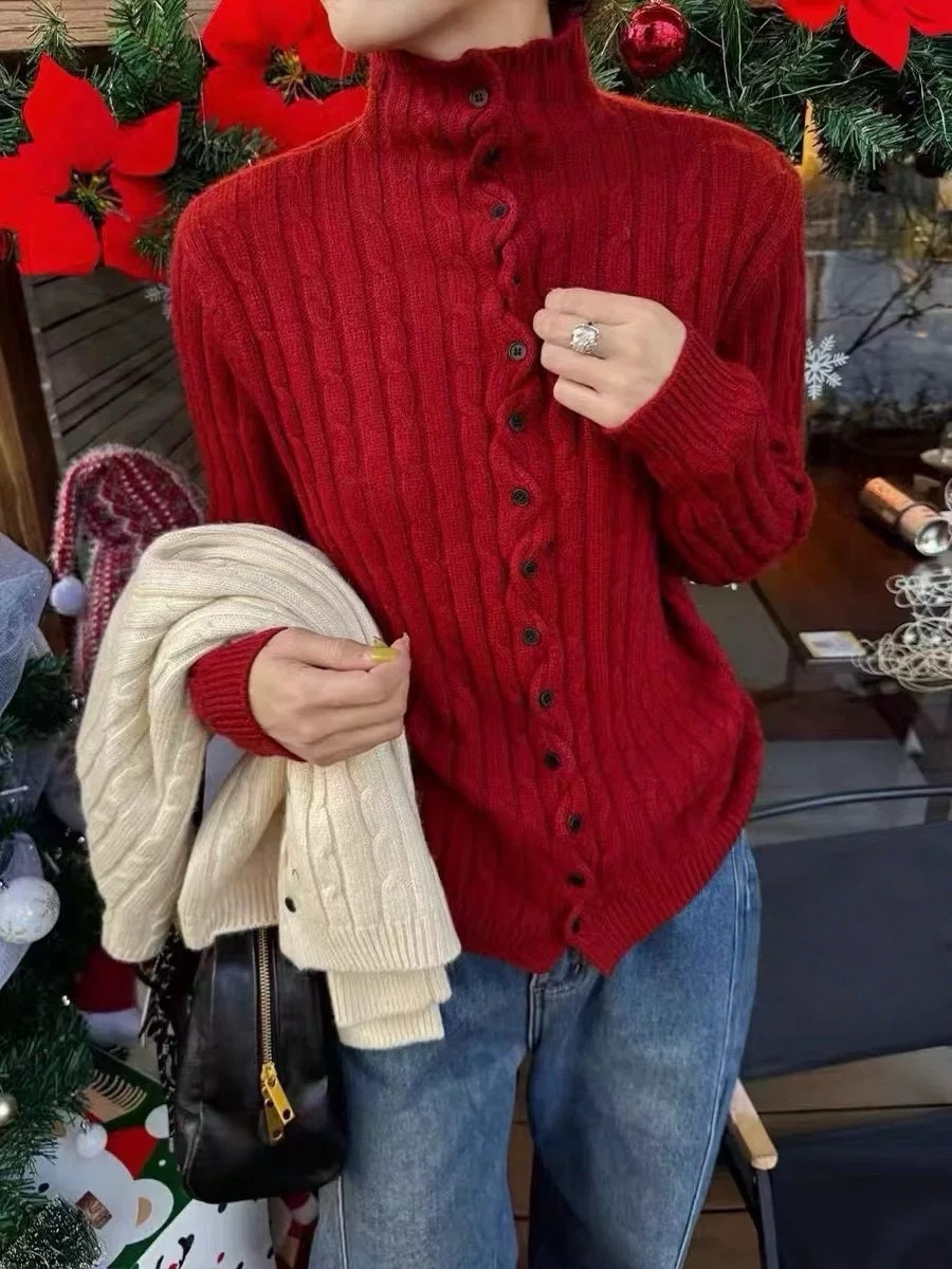 红色高领针织开衫女秋冬2025新款圣诞节感气质纯羊毛打底毛衣