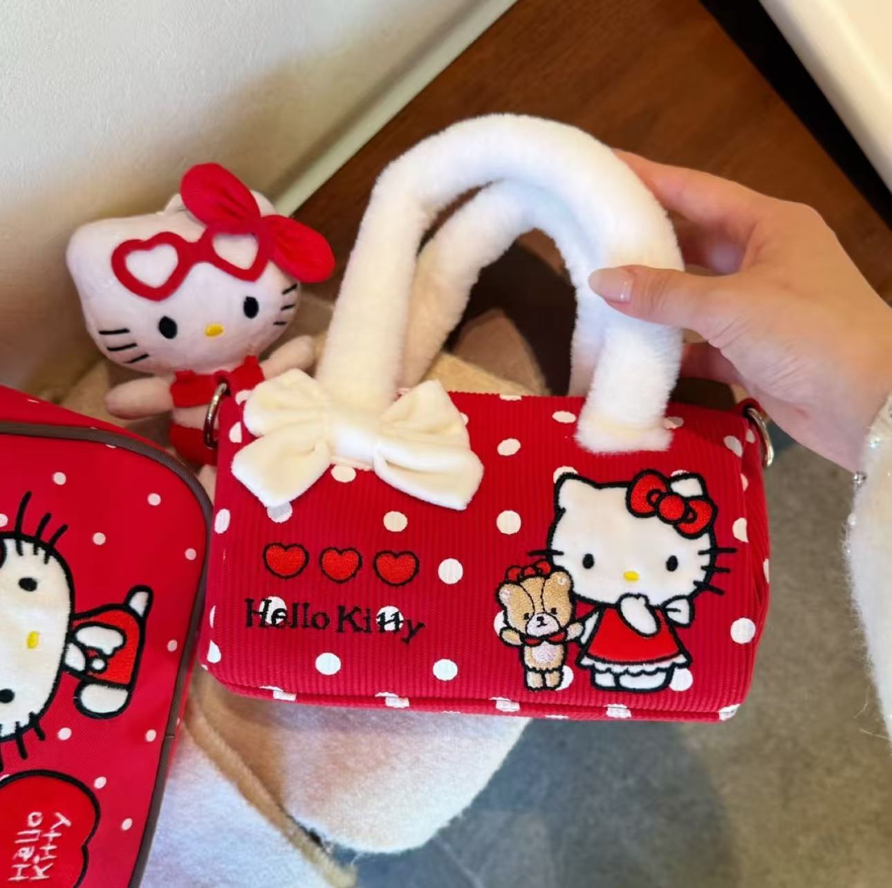 可爱凯蒂猫波点手提包少女心新年红斜挎包高颜值百搭托特包手拎包