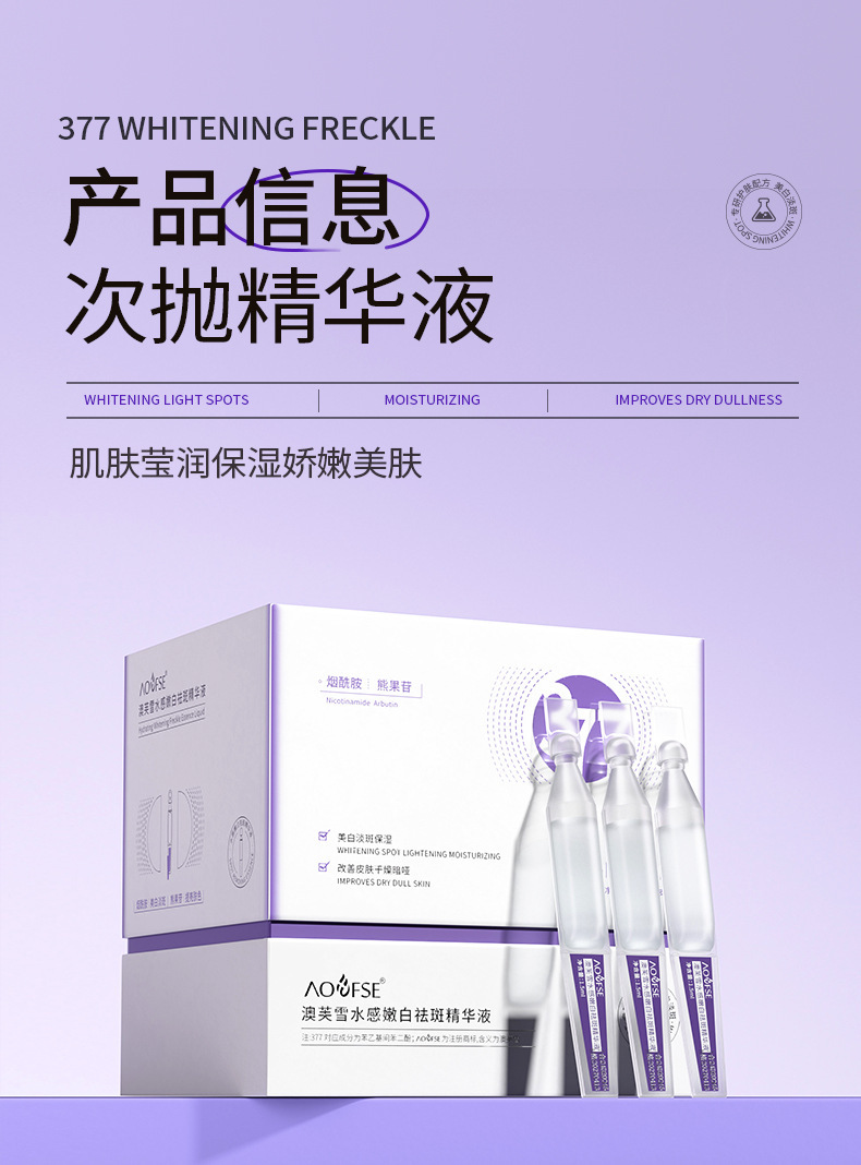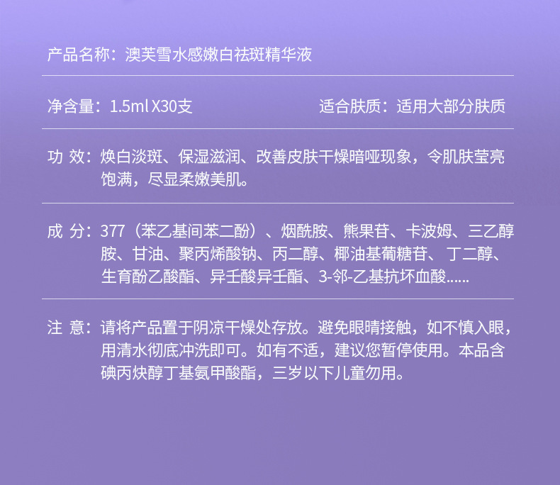 产品规格 澳芙雪377次抛紫白(1.5ml*30),澳芙雪377次抛美白祛斑精华(1盒10支)