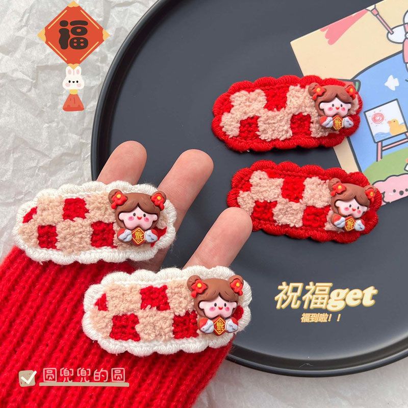 新年红福气女孩毛线bb夹可爱卡通发卡少女心毛绒发夹儿童发饰