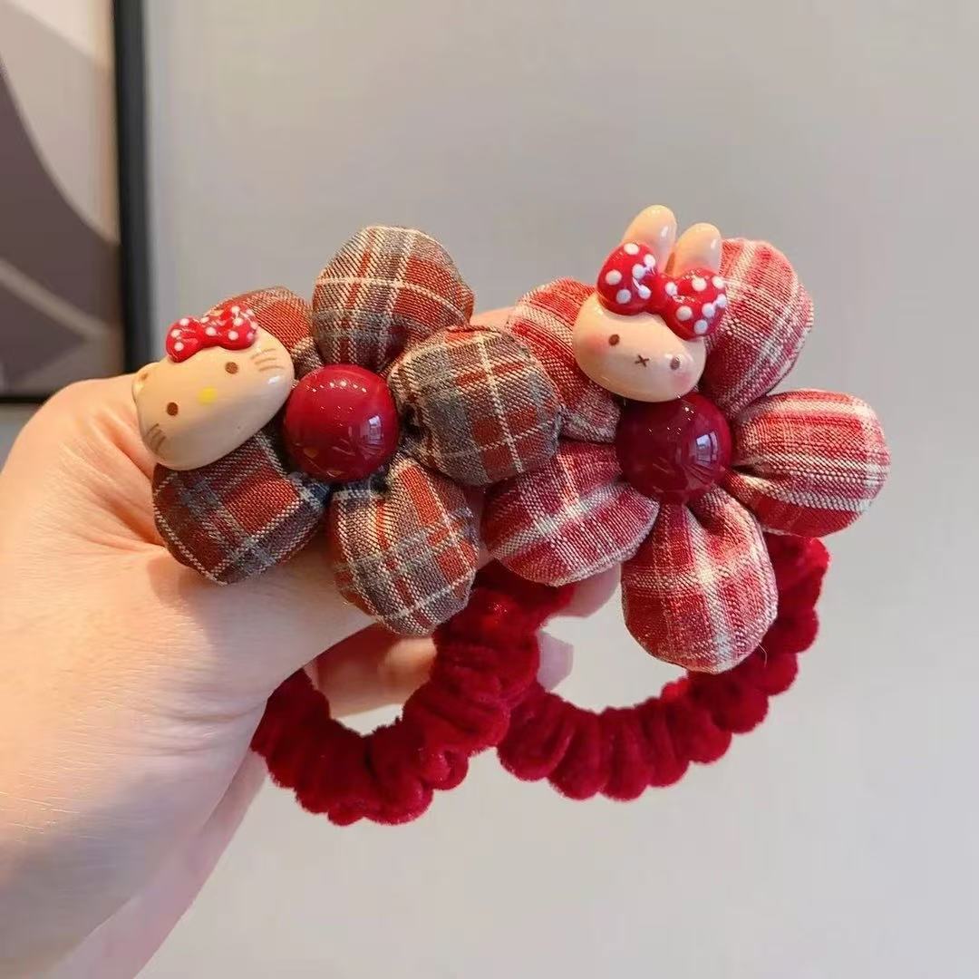 2026红色格纹花朵发圈女童可爱卡通丸子头扎发绳韩系新年春节头绳