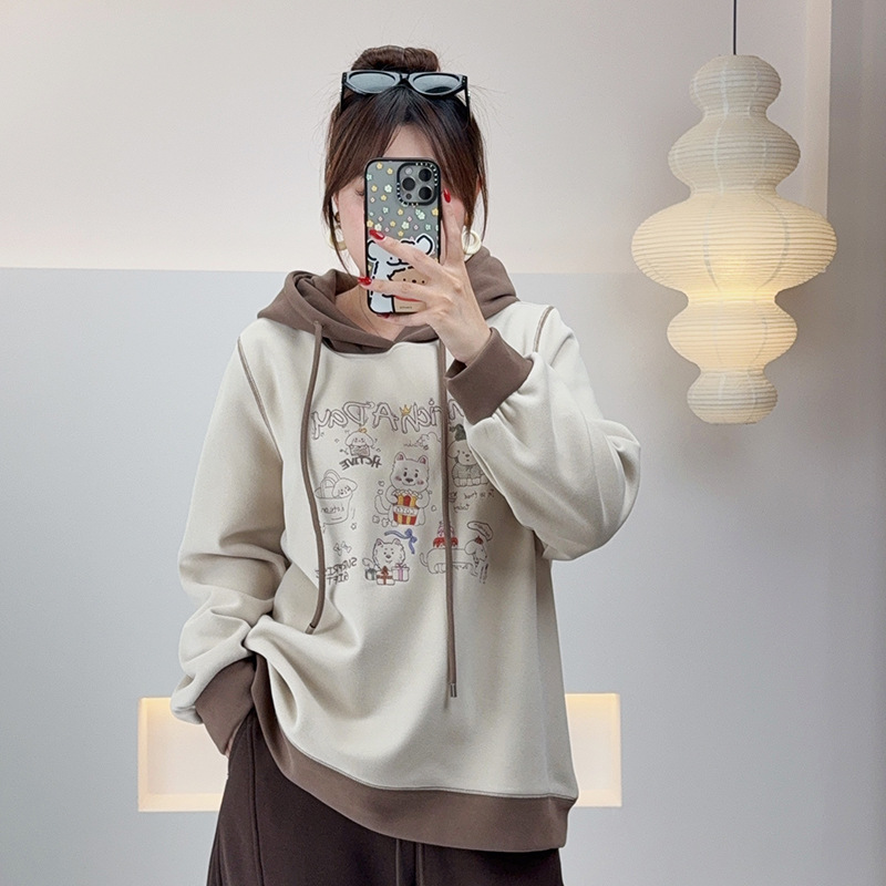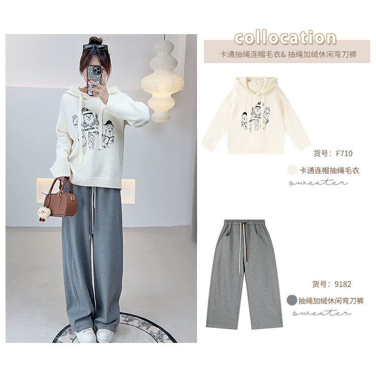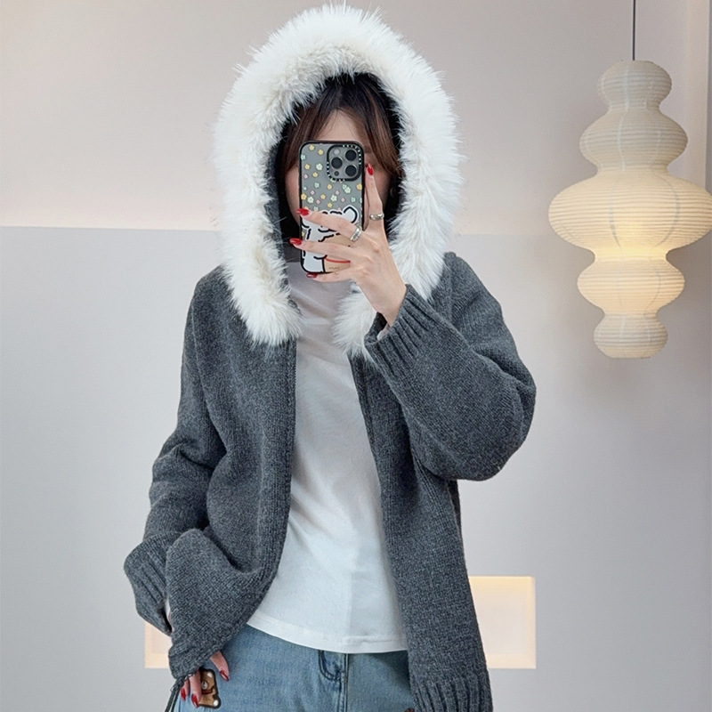 敲ji有冬日氛围感的毛毛边连帽刺绣图案针织毛衣