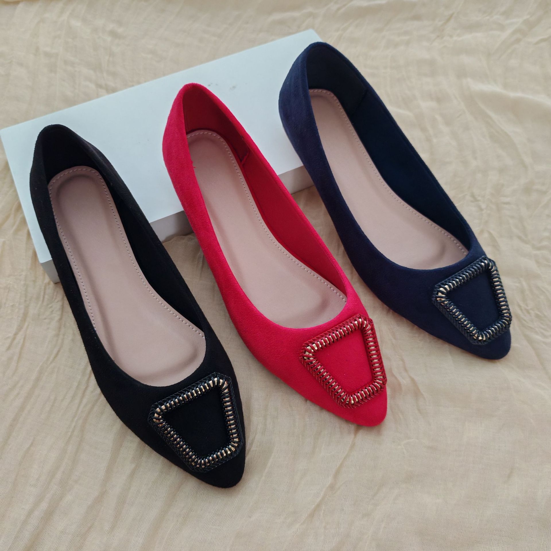 フレンチスタイルの尖ったつま先、スクエアバックル、フラットシューズ、女性らしい気質、高級感のあるベルベット、細ヒール、シングルシューズ、浅口、万能、ローヒール