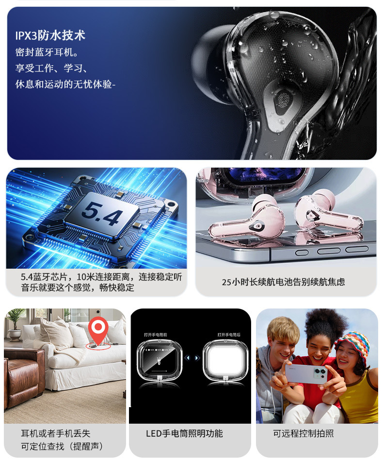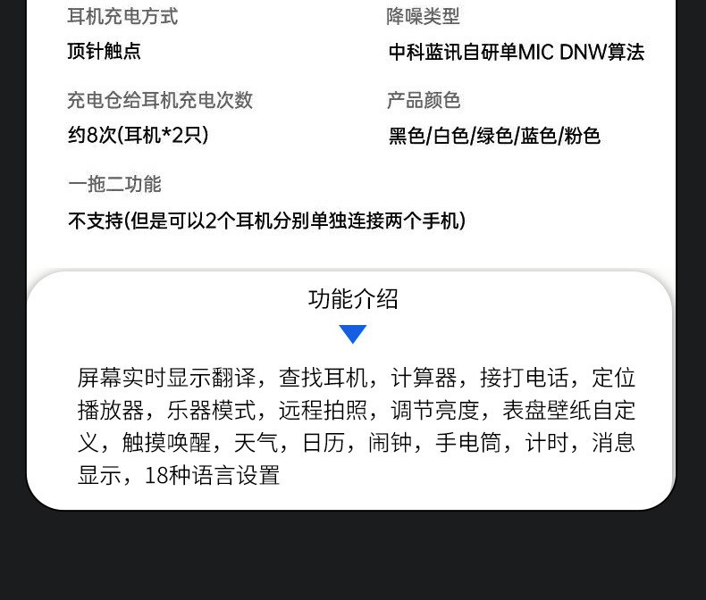 功能 立体声,降噪,电量显示,超长续航,NFC功能,语音控制,支持音乐,手势触控,高清无损传输,AI语音助手,单双耳自由切换,智能音效调节,其他