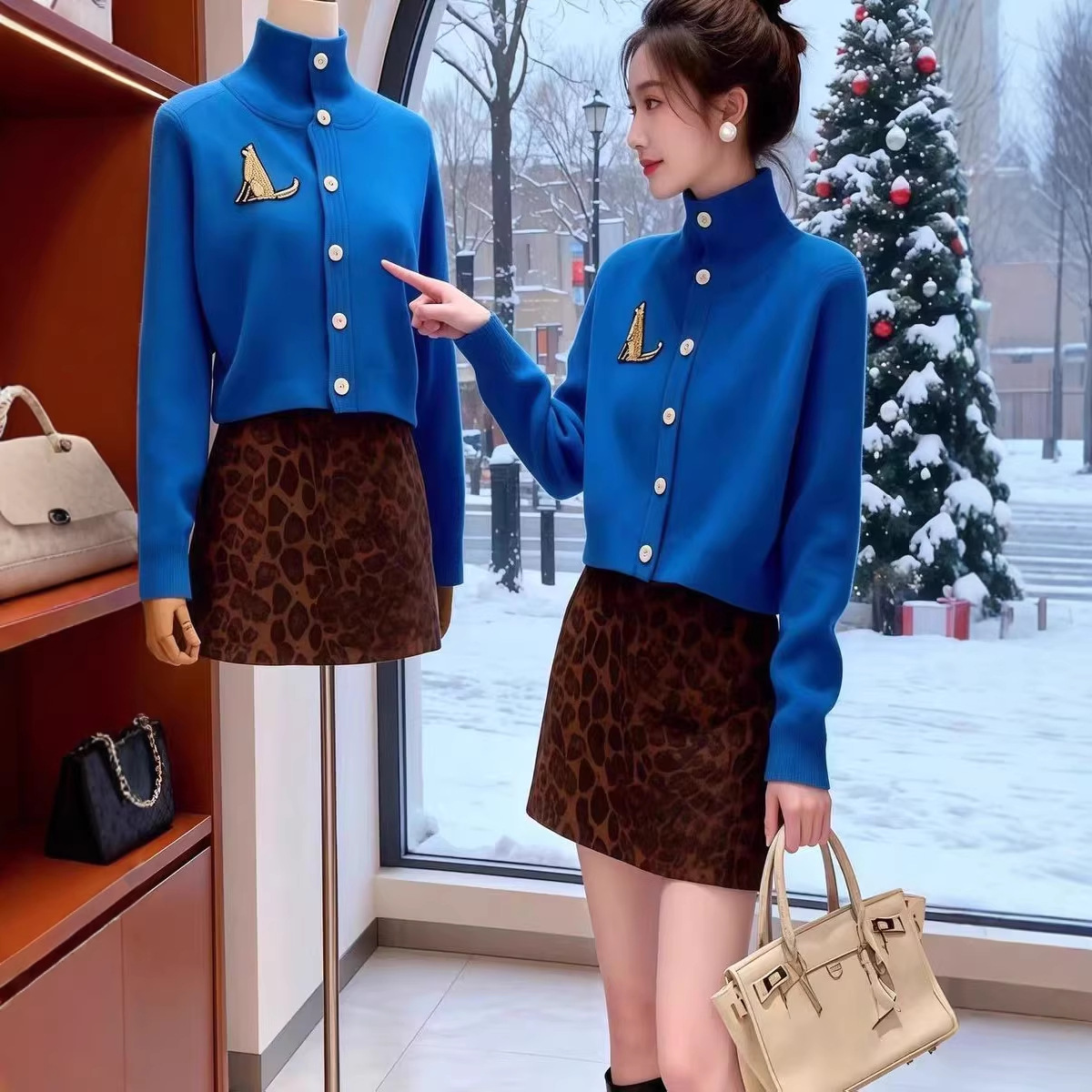 哥家专柜品质秋季新款蓝色时尚百搭高领刺绣针织开衫纽扣宽松毛衣