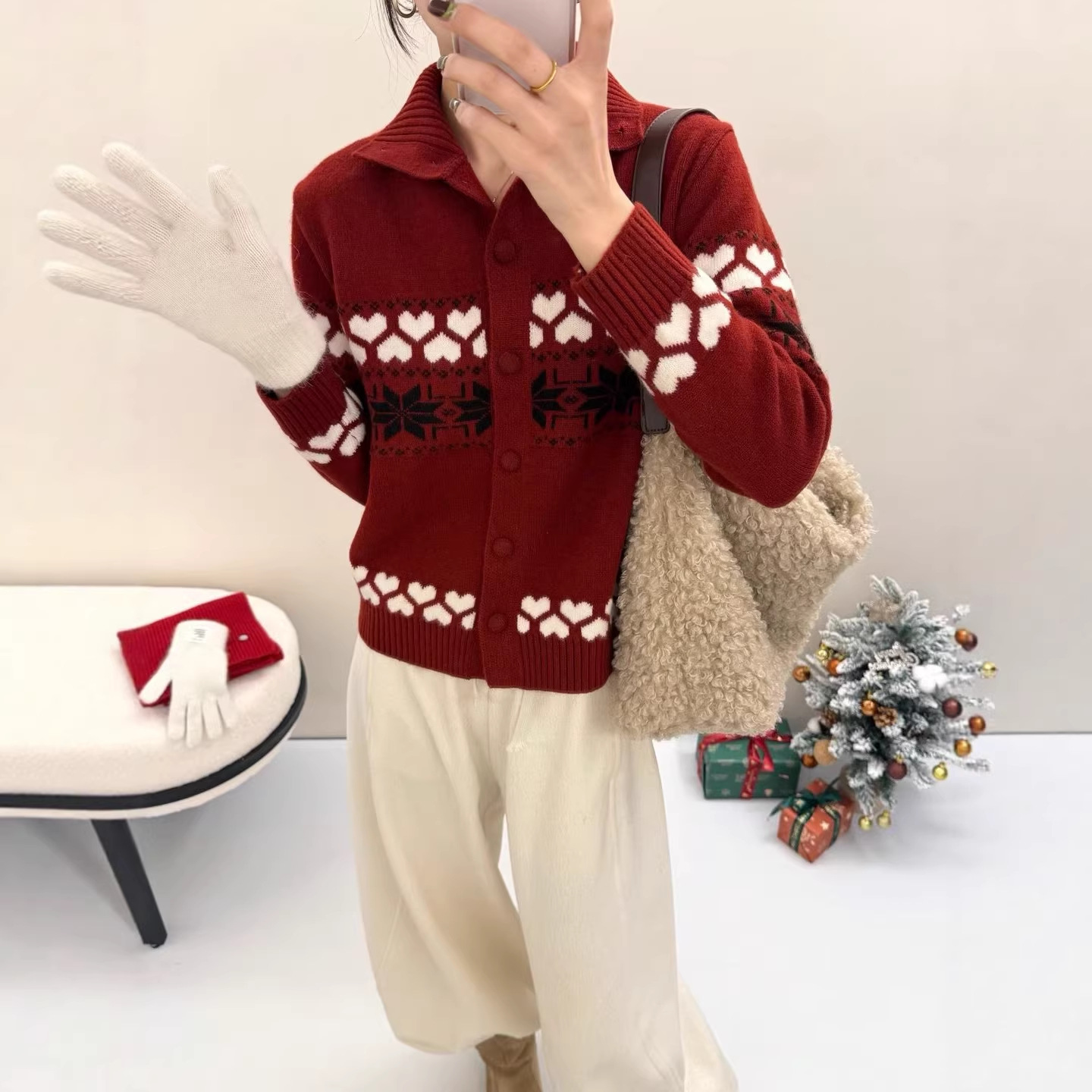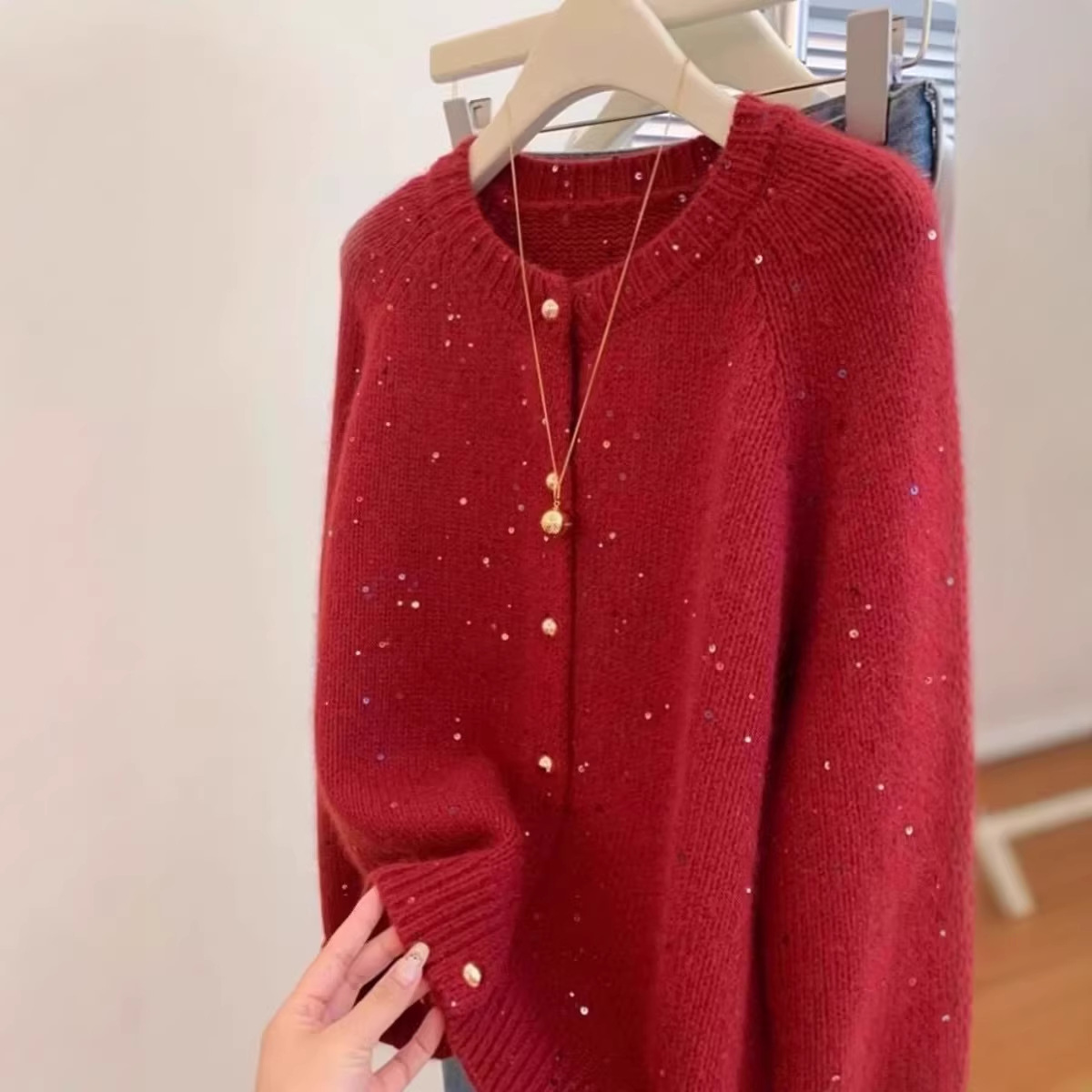 哥家专柜品质温柔氛围感亮片圆领毛衣开衫女秋冬本命新年复古红