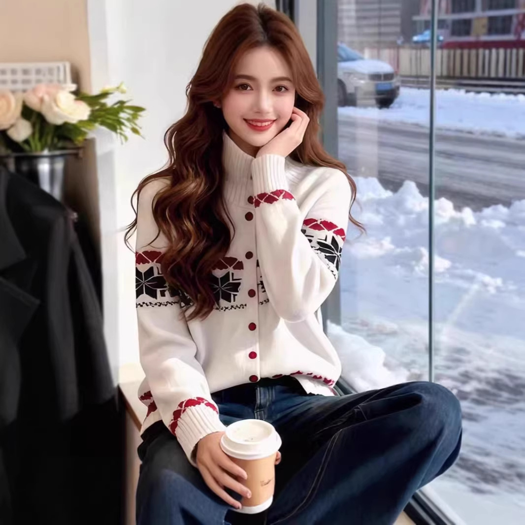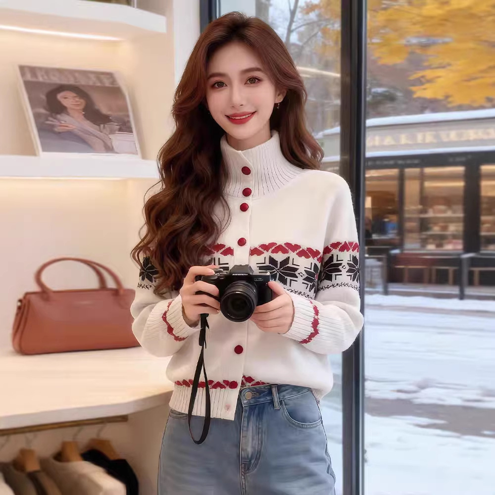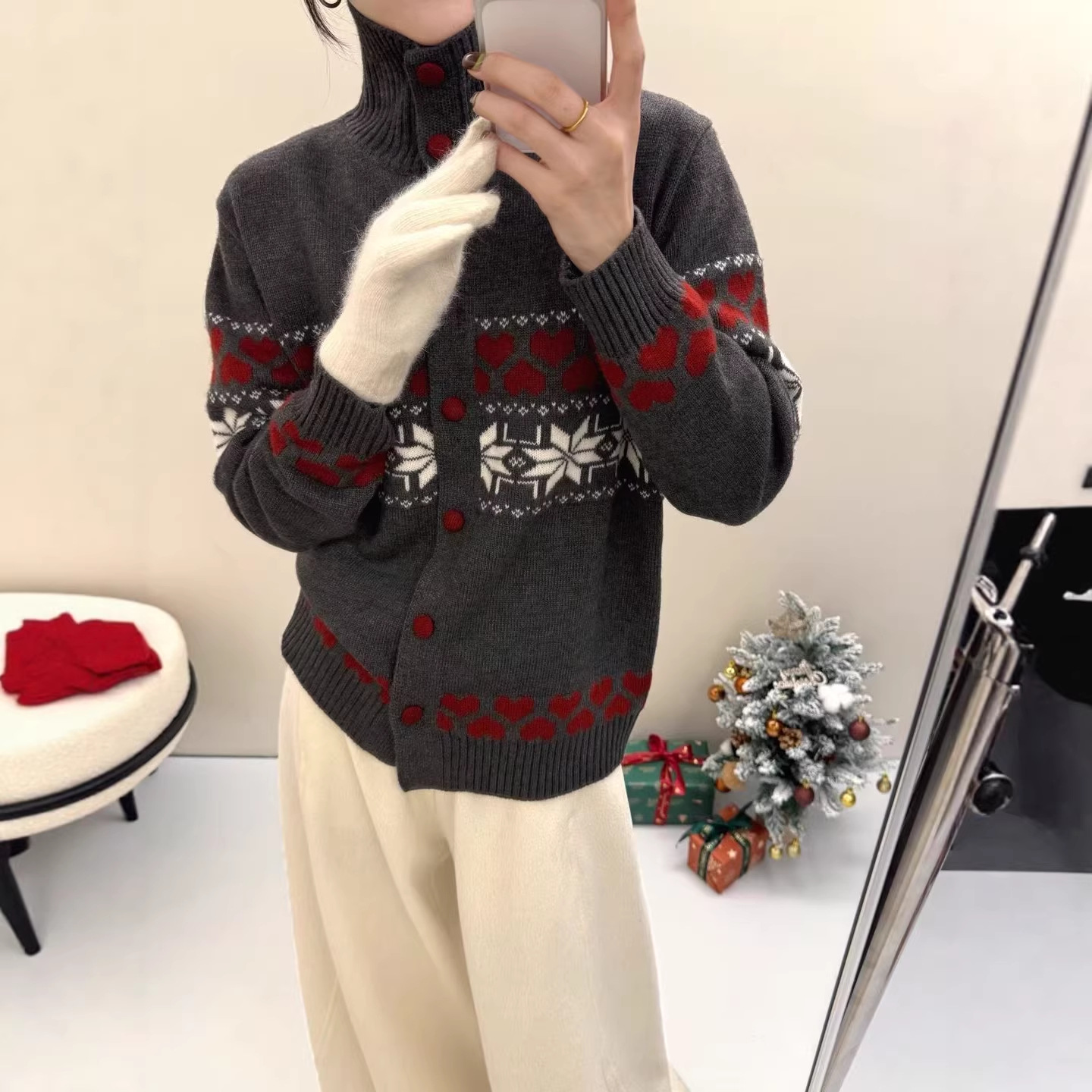 哥家专柜品质秋冬新款费尔岛复古提花加厚高领纽扣针织毛衣外套女