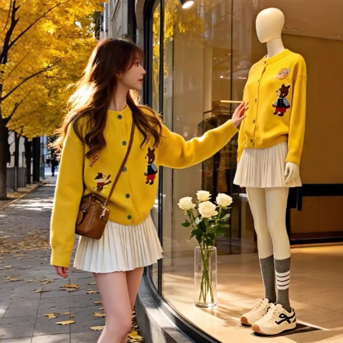 哥家专柜品质秋冬新款韩版温柔黄色宽松设计感卡通开衫针织毛衣女