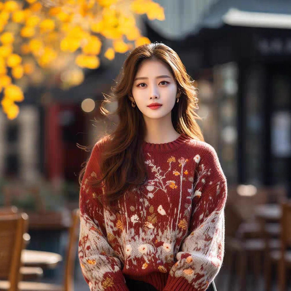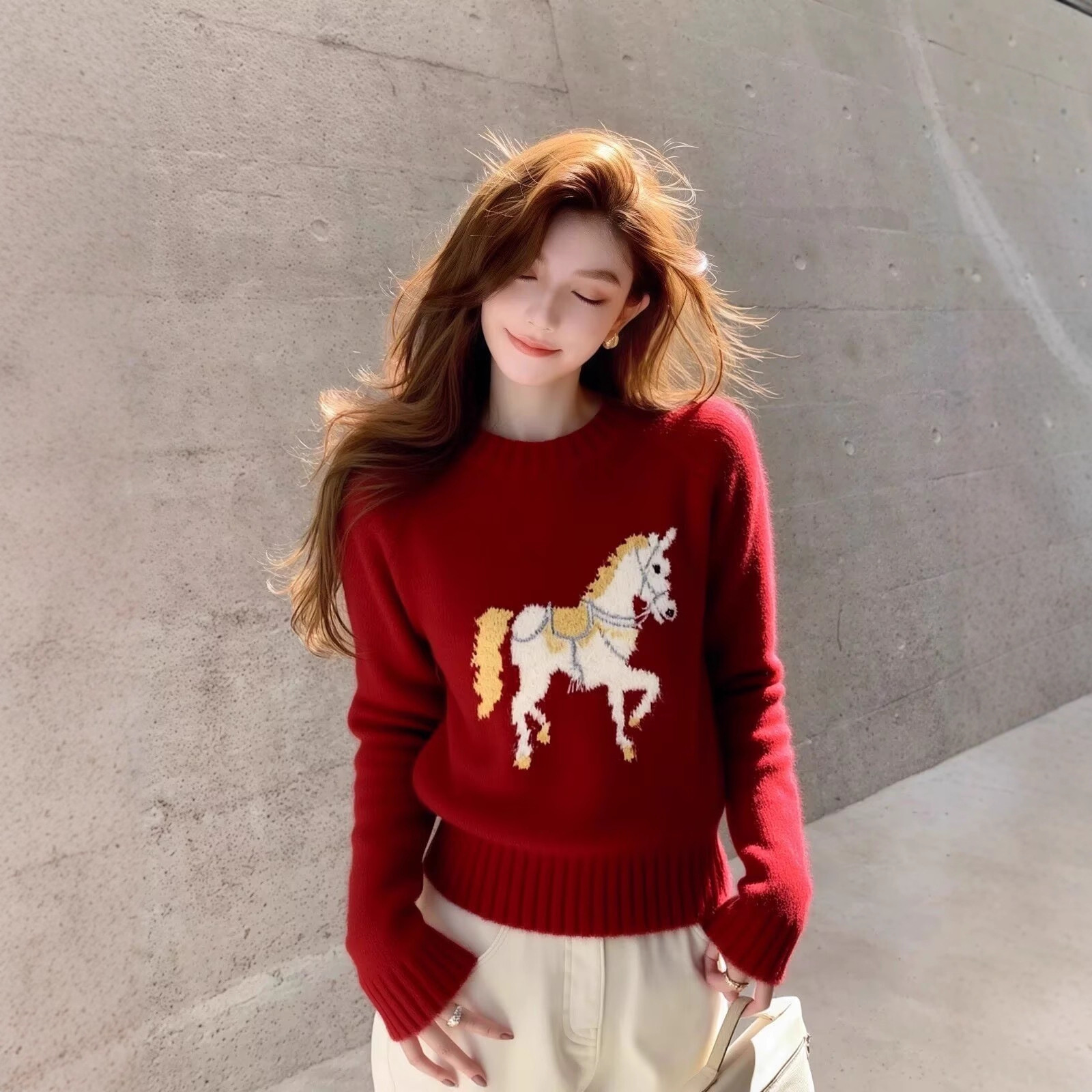 哥家专柜品质秋冬新款复古白马提花圆领红色针织衫宽松慵懒风毛衣