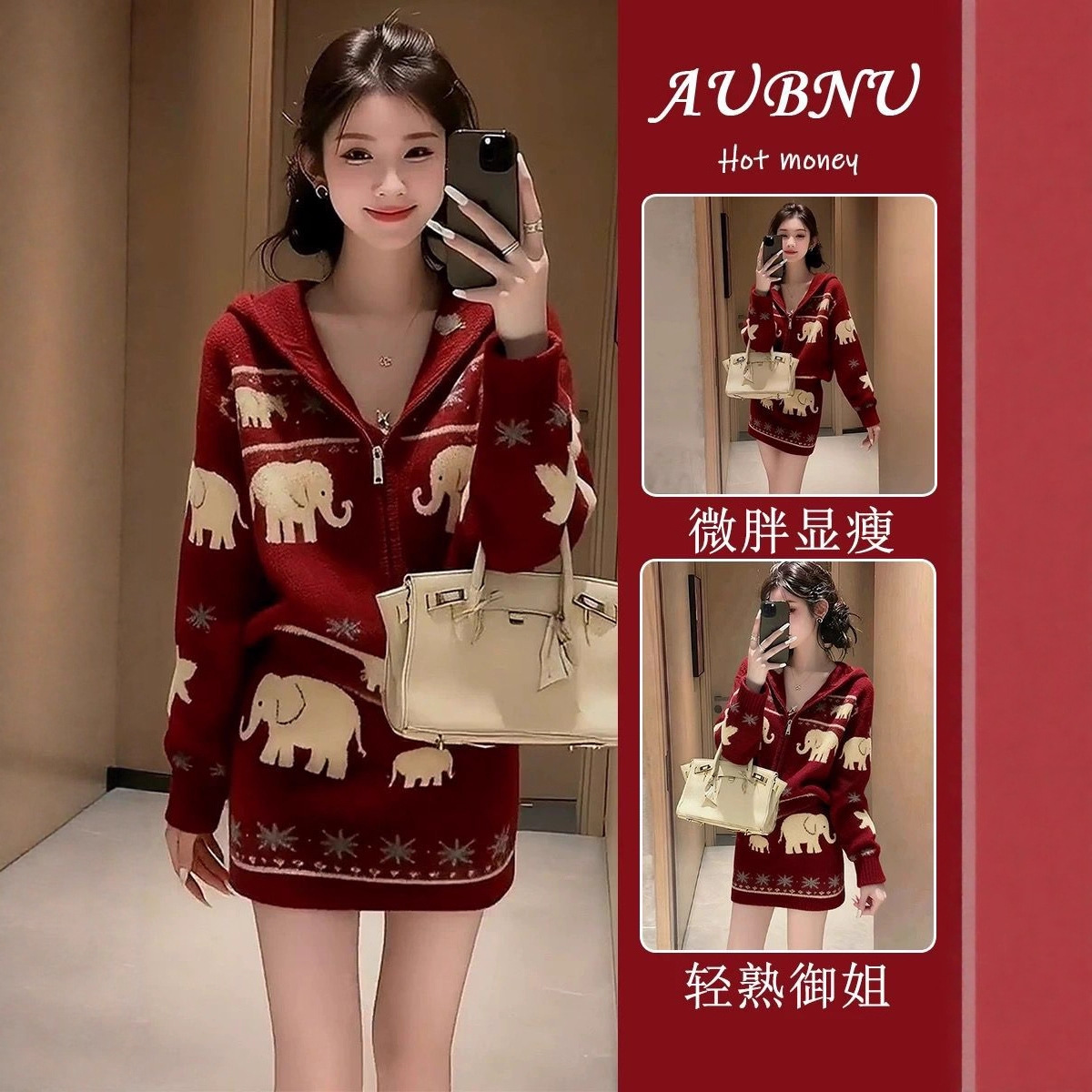 哥家专柜品质秋冬新款圣诞风针织连衣裙女装一整套圣诞氛围感穿