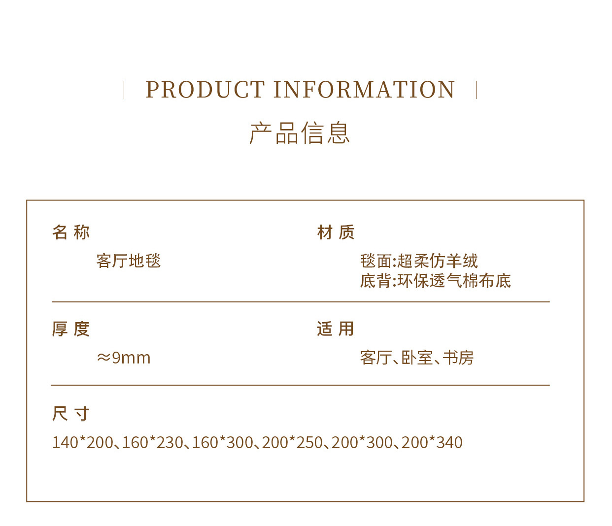 尺寸 60x160cm,120x160cm【可上扫地机器人】,140x200cm【防水防污好打理】,160x230cm【凝水毯面易清洁】,160x300cm【适合中小型客厅】,200x250cm【适合3人或L型沙发】,200x300cm【客厅大尺寸推荐!】,200x340cm【适合3人或L型沙发】,240x360cm【适合4人或L型沙发】,240x400cm【适合4人或L型沙发】,300x400cm【适合超大客厅】,定制不支持退换联系客服,300*450cm【定制尺寸 咨询客服】