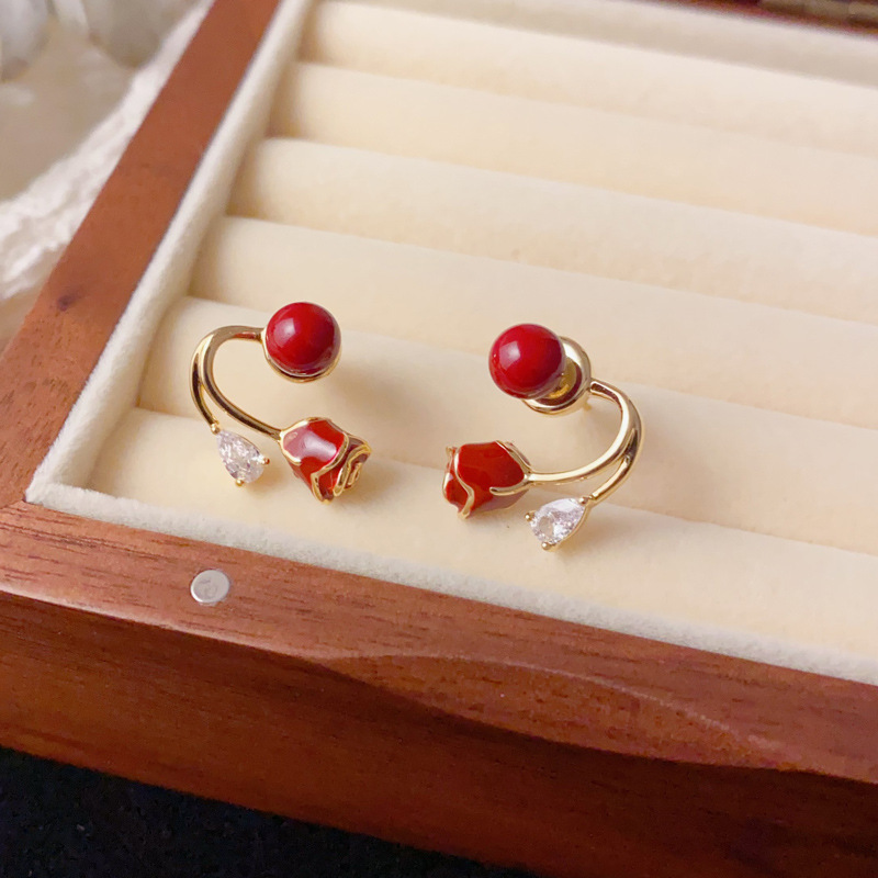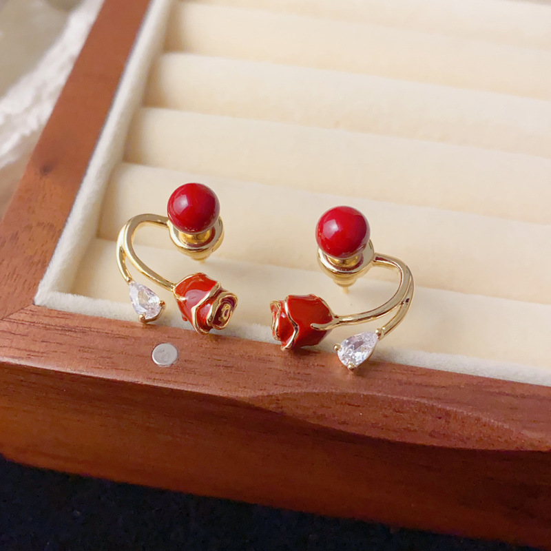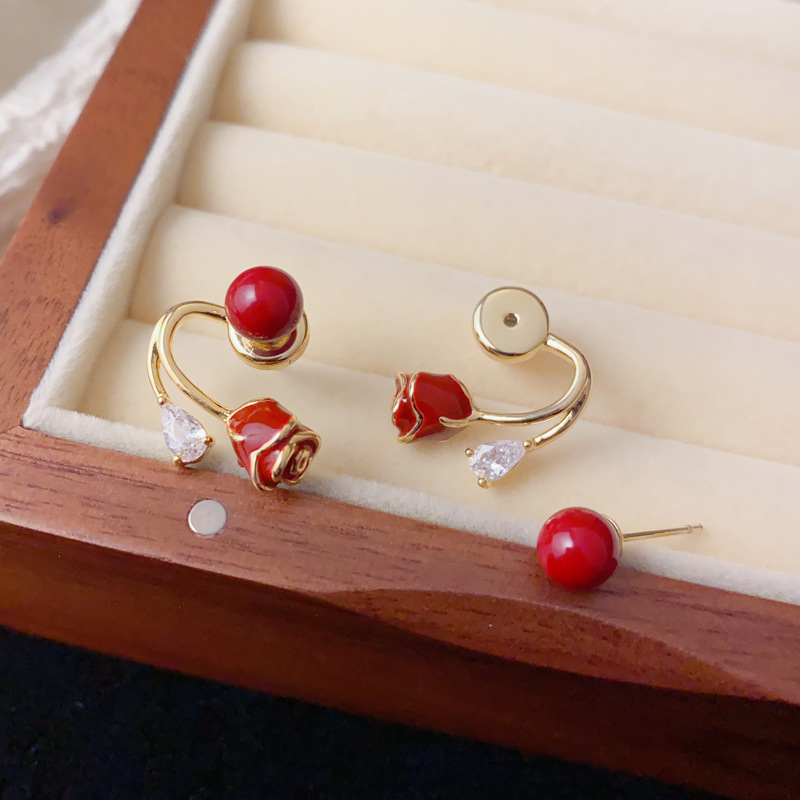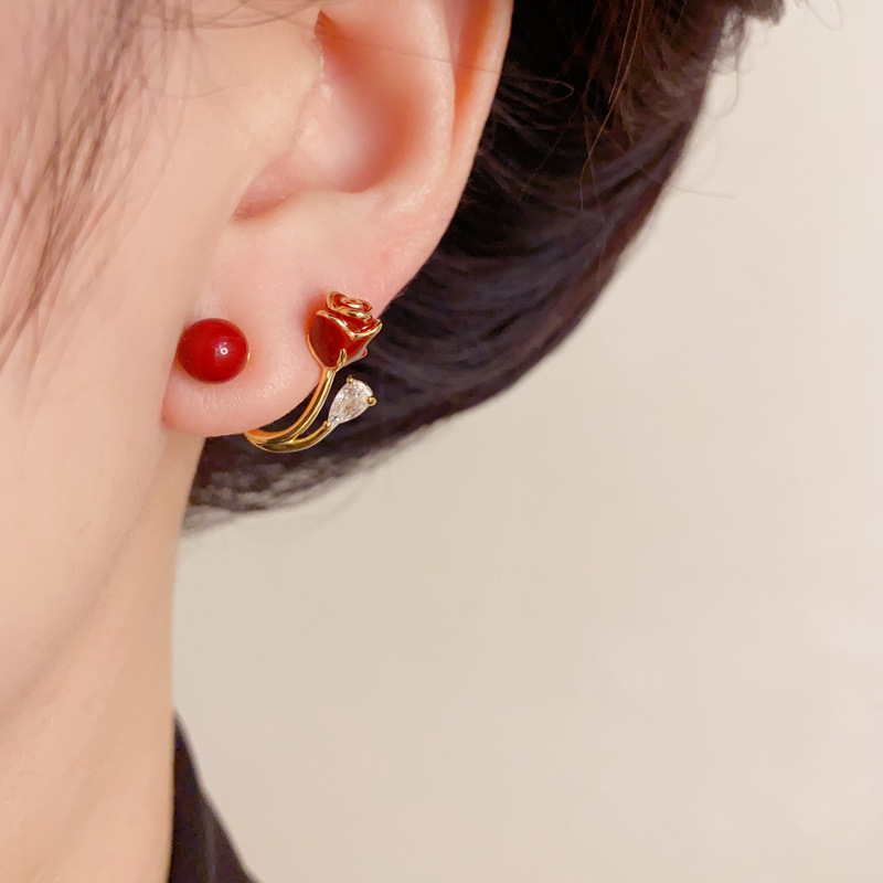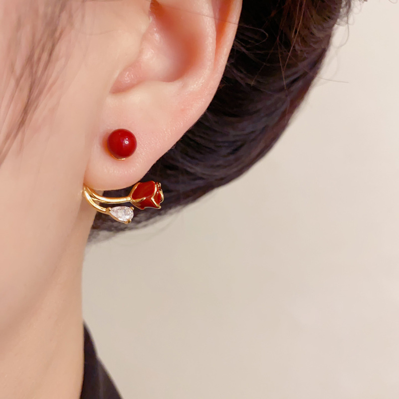 日韩时尚甜美百搭红色两戴玫瑰花耳钉小众气质简约设计感耳环批发