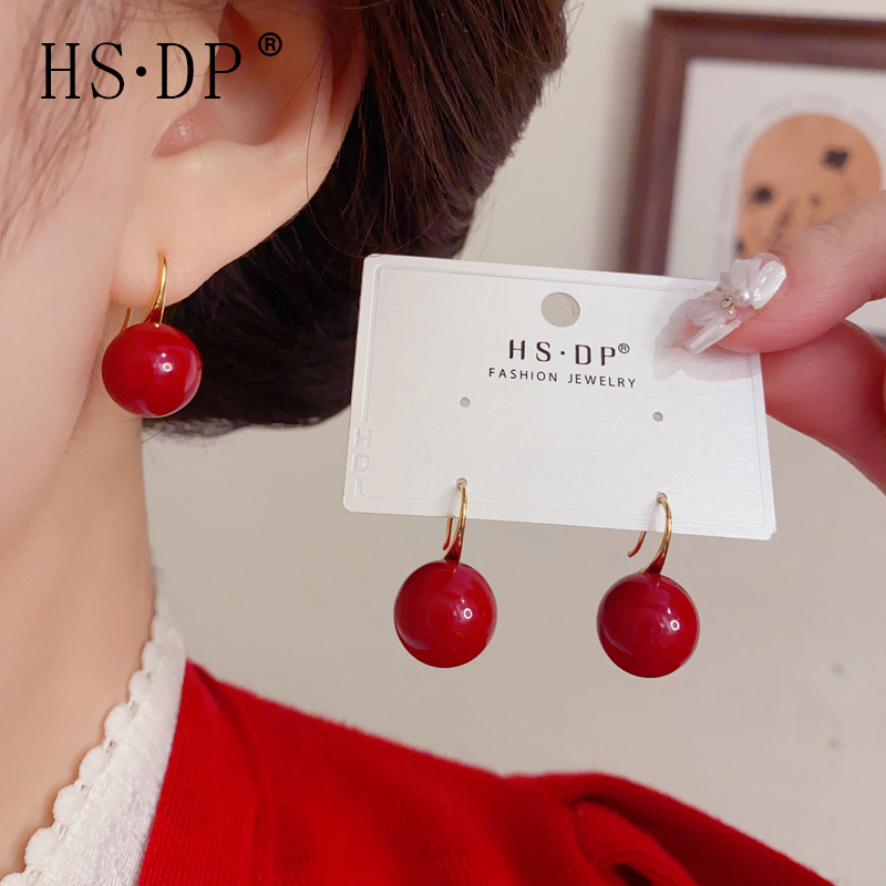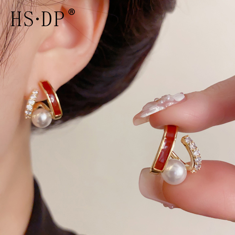 法式气质时尚简约红色珍珠耳钩女个性轻奢百搭高级感耳环耳饰批发