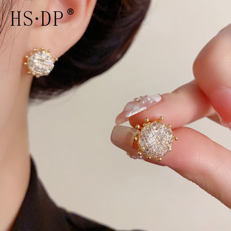 小众时尚简约镶钻网格圆形耳钉女精致轻奢百搭高级感超闪耳环批发
