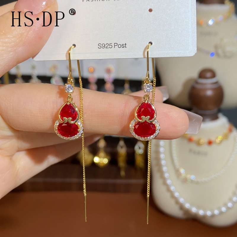 小众百搭红色锆石葫芦长款耳线女高级感气质耳环时尚轻奢风耳饰品