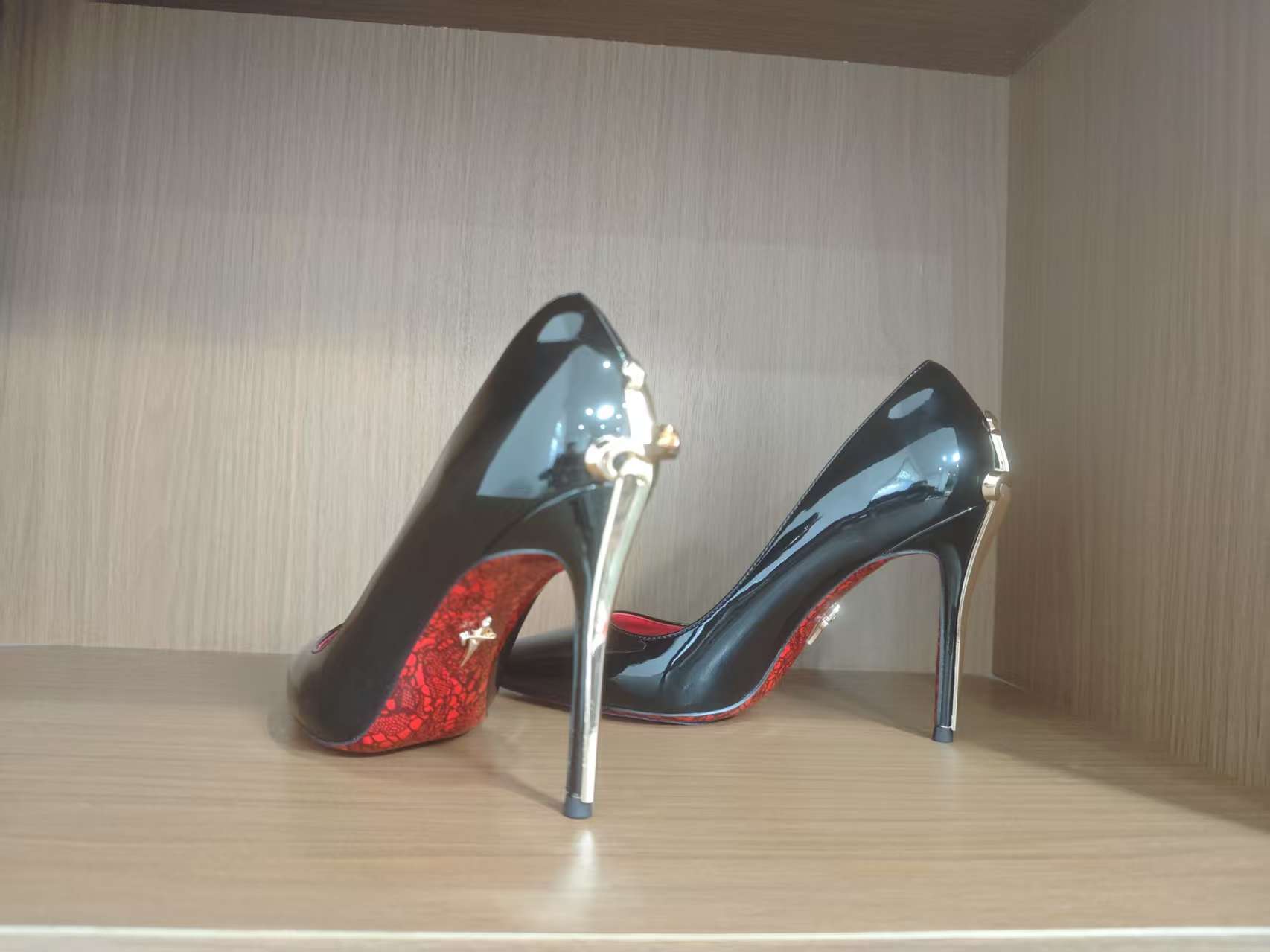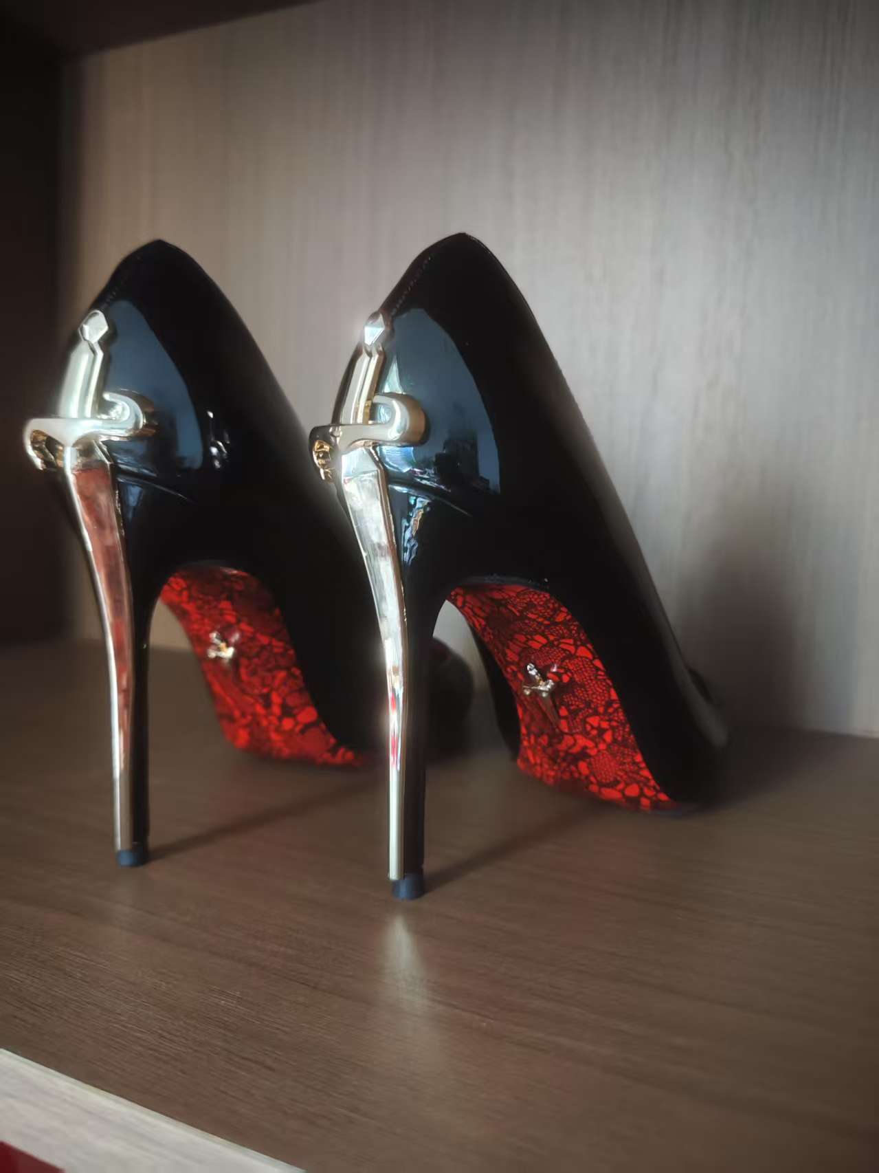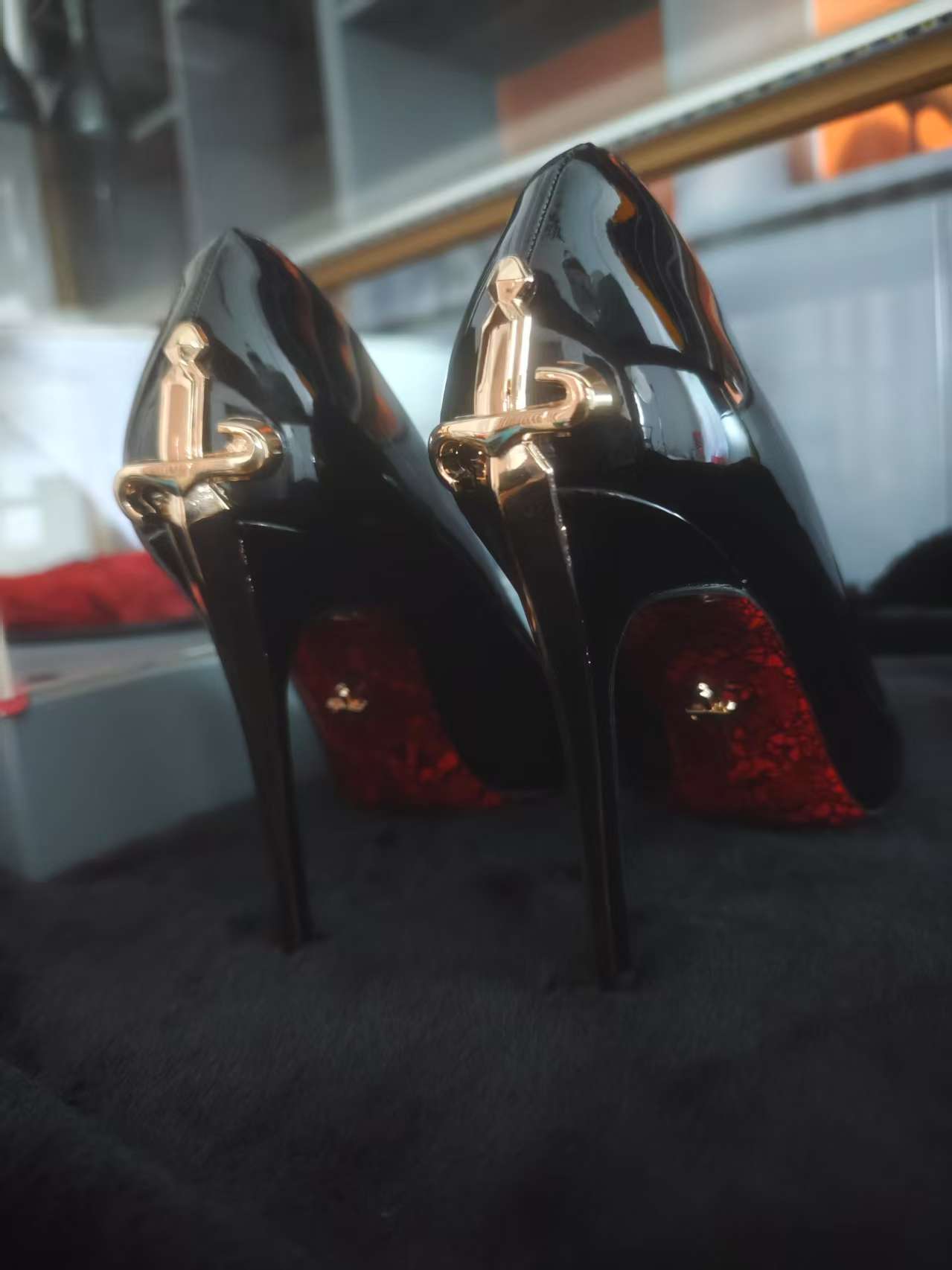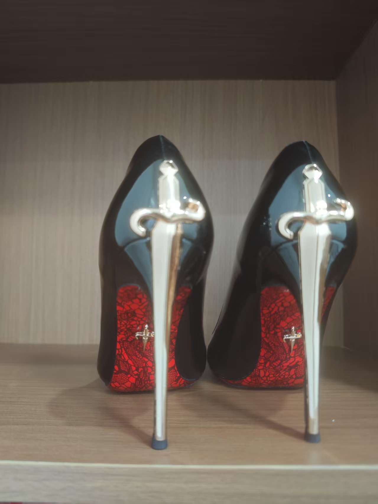 2026新款金色利刃权杖红底印花细跟御姐风高级黑色漆皮高跟女单鞋