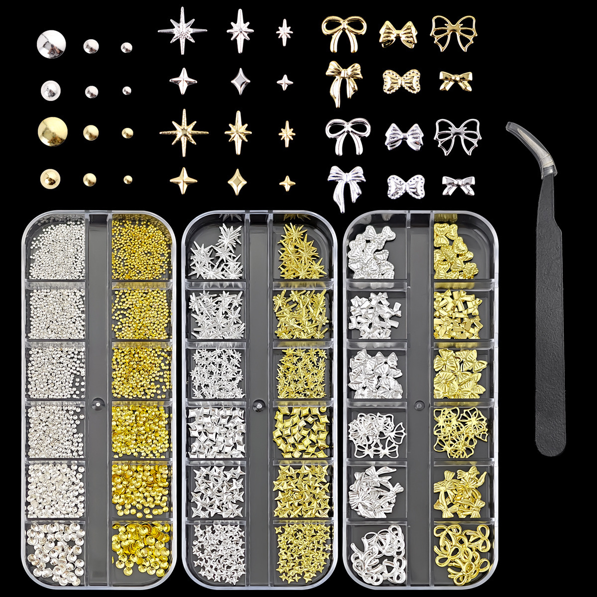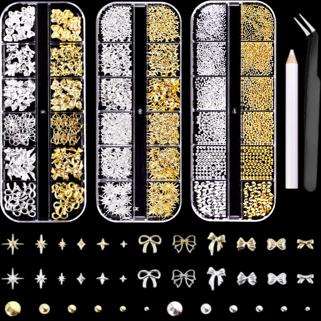 爆闪金银色美甲饰品金属贴片蝴蝶结星芒蝴蝶铆钉圆珠长条盒装饰品