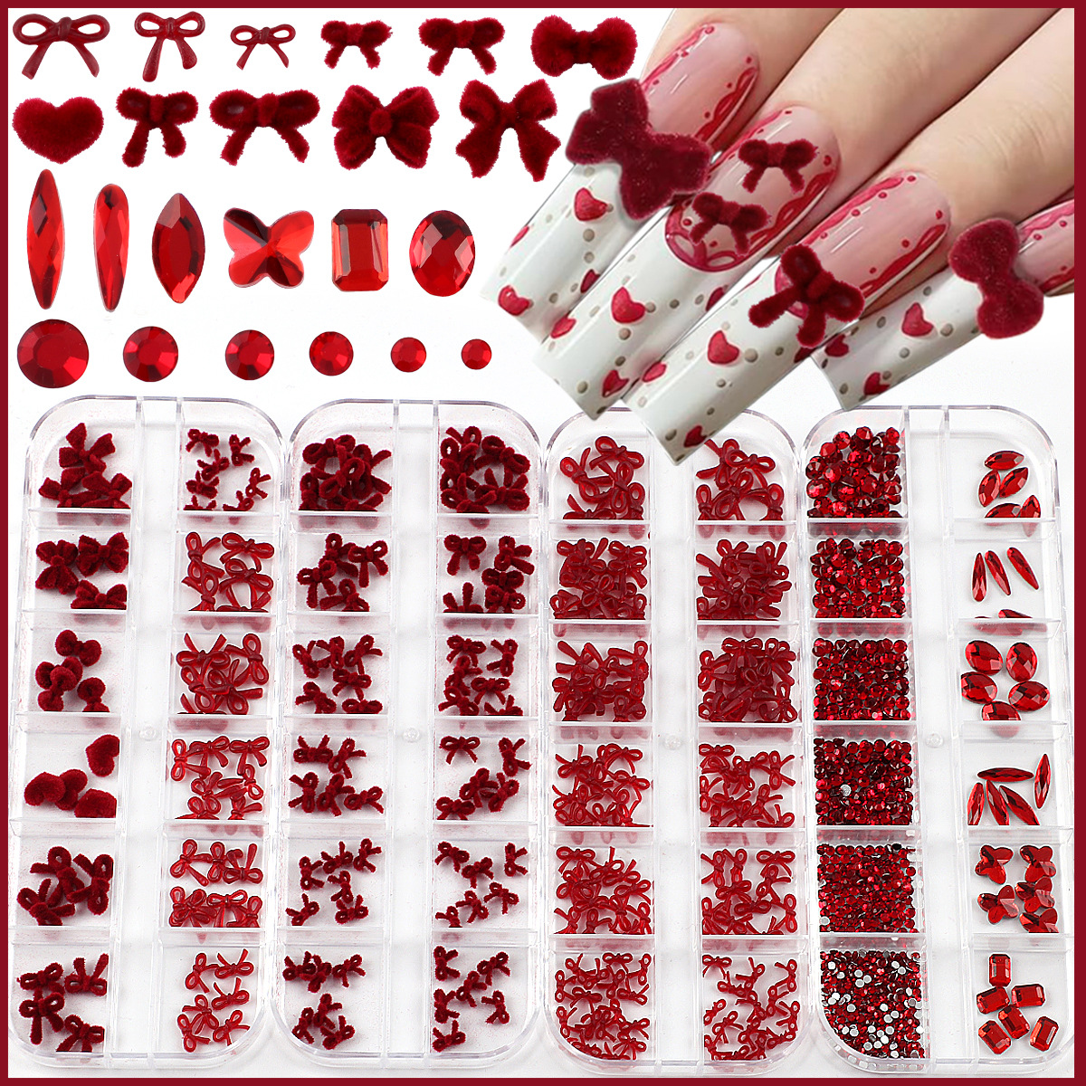 小红书爆款酒红植绒蝴蝶结美甲饰品新年圣诞花环小配饰网红穿戴甲
