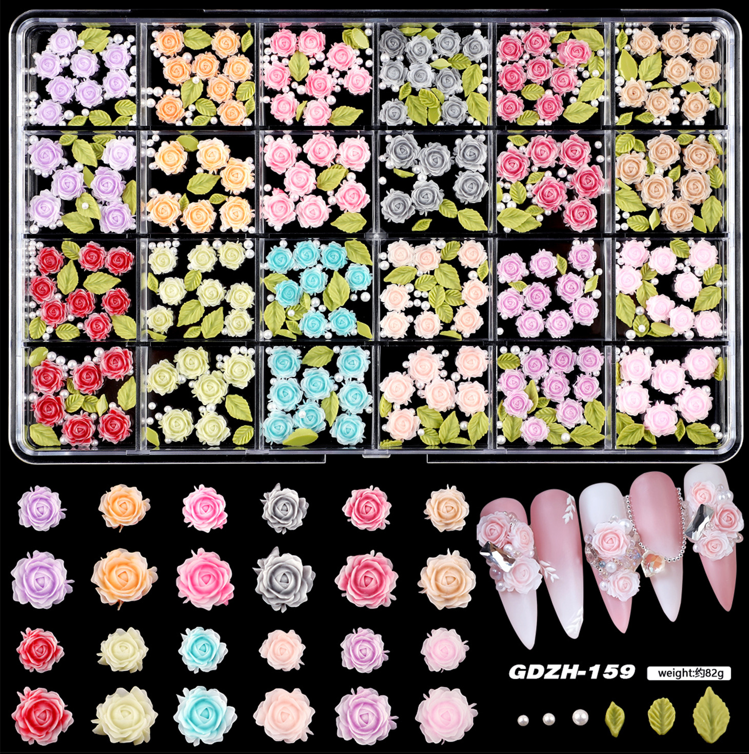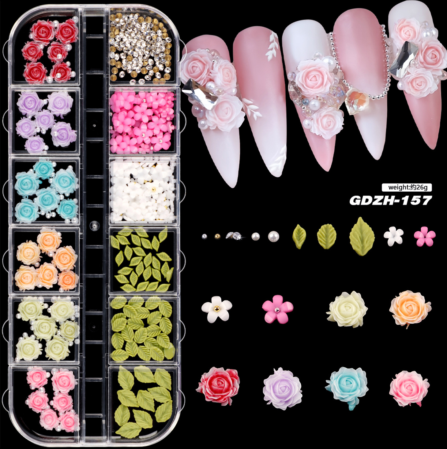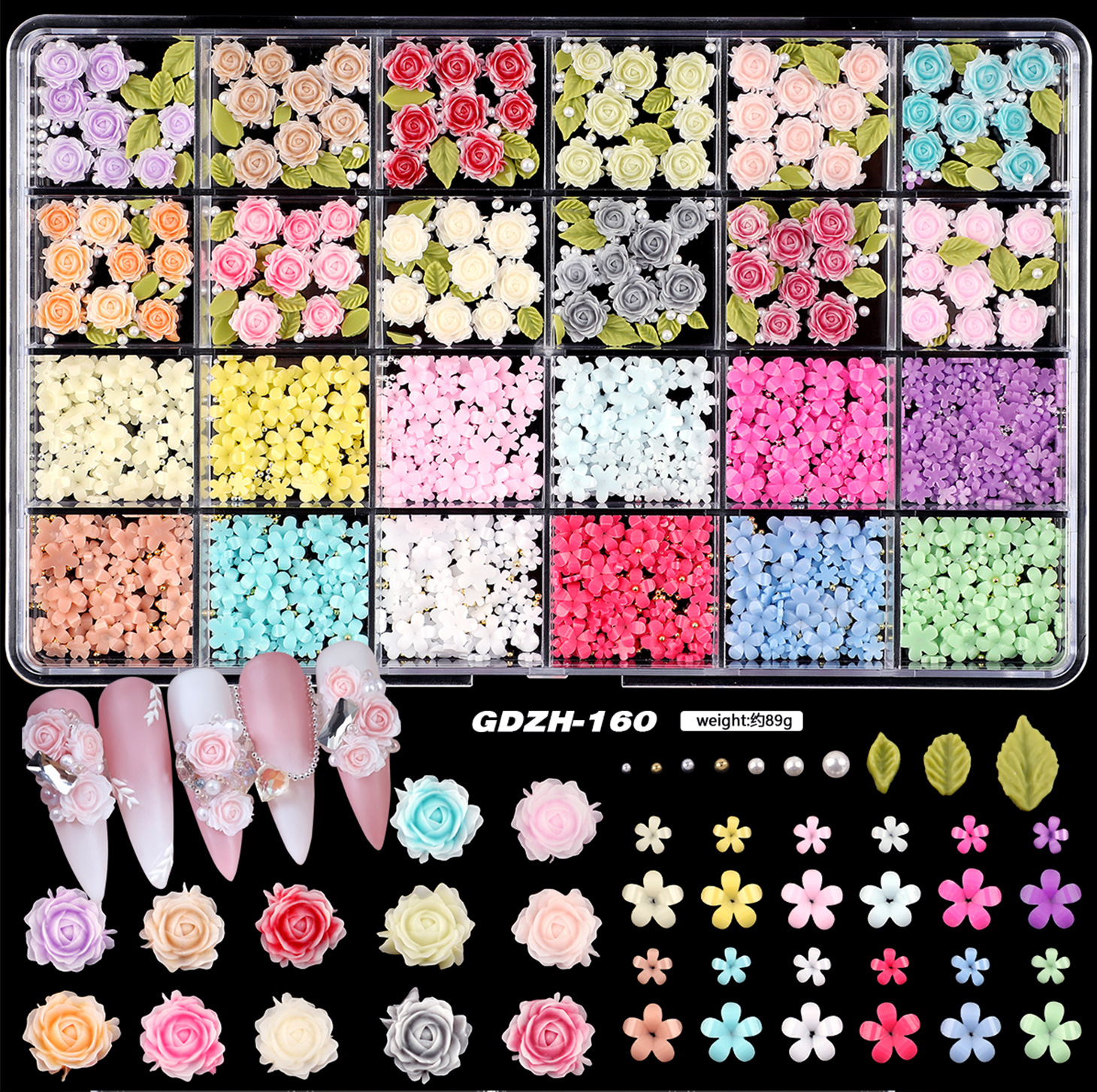 跨境新款24格美甲合金饰品树脂蝴蝶结软胶冰雕花立体花朵水钻混装