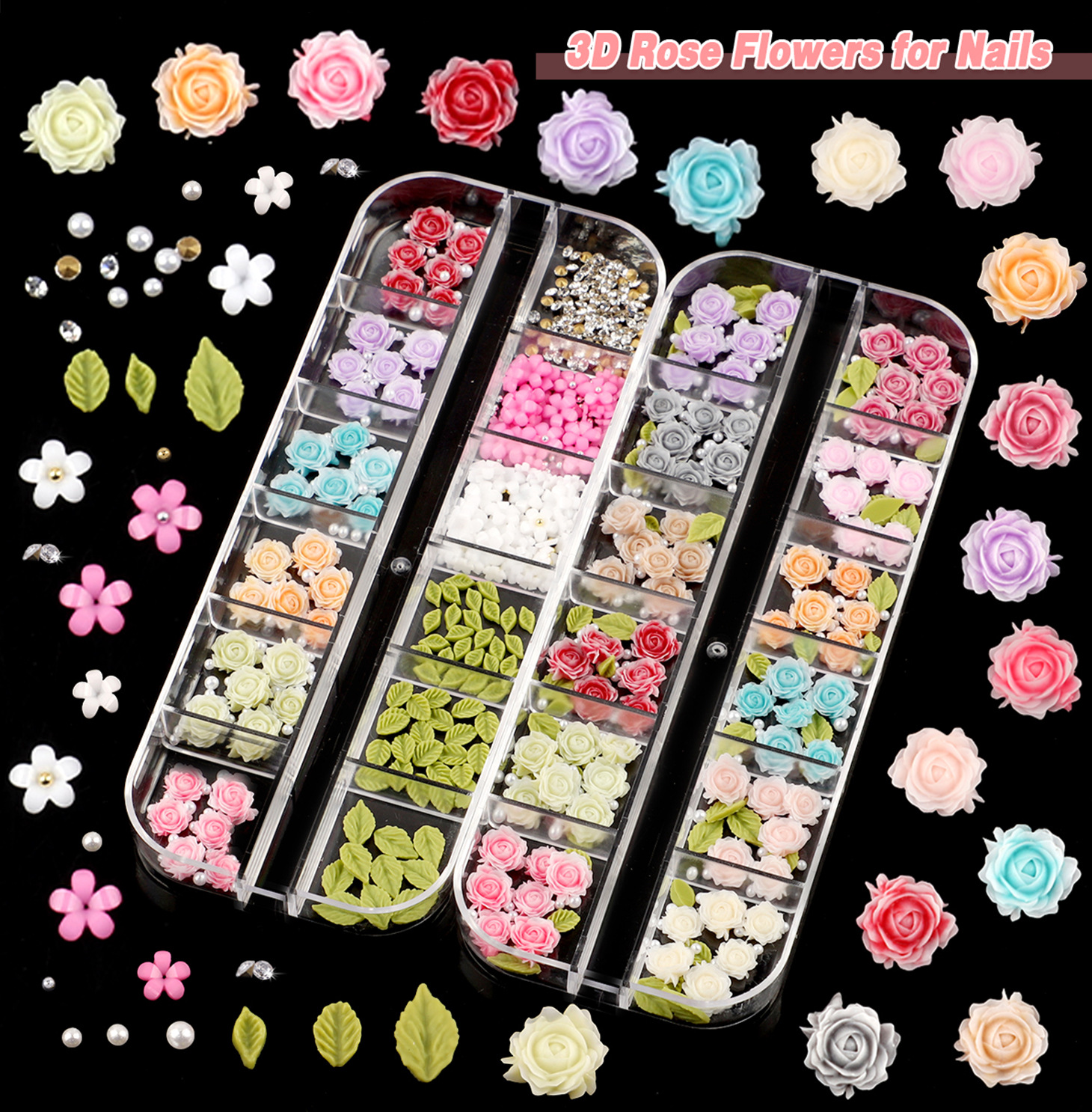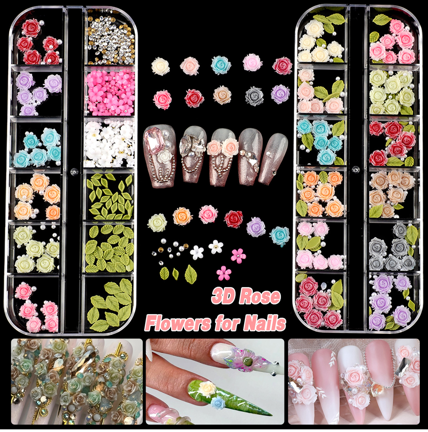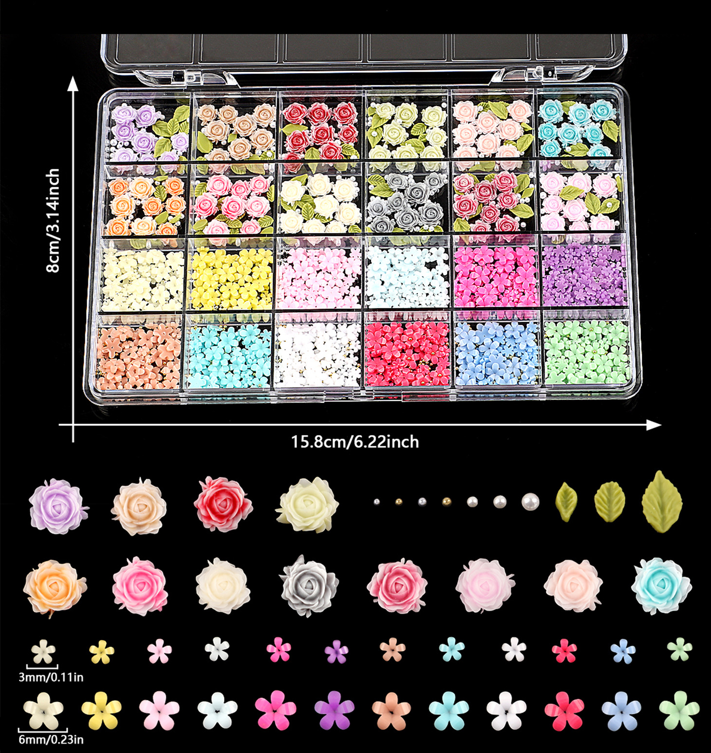 跨境新款24格美甲合金饰品树脂蝴蝶结软胶冰雕花立体花朵水钻混装