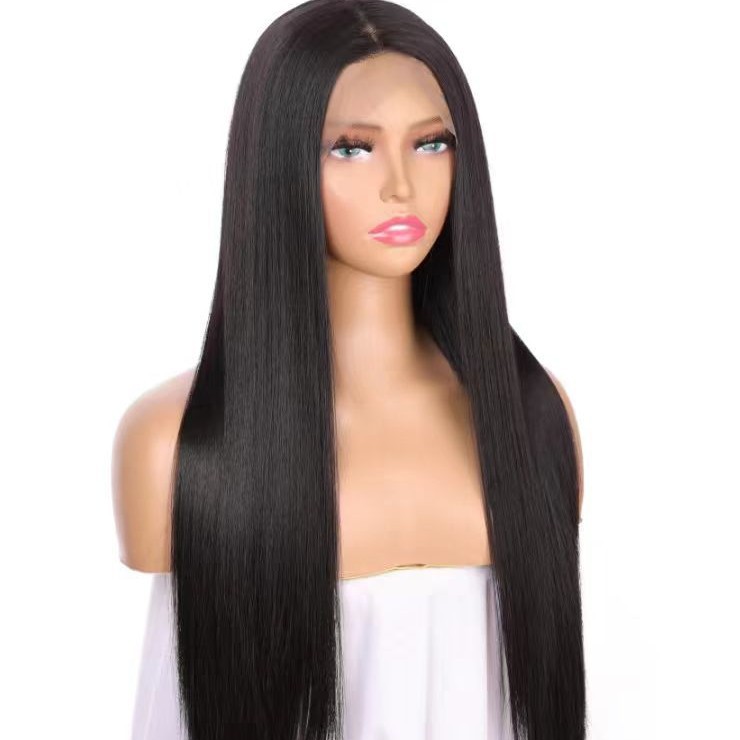 欧美跨境简约自然手钩黑色长直发厂家批发化纤前蕾丝女士假发头套