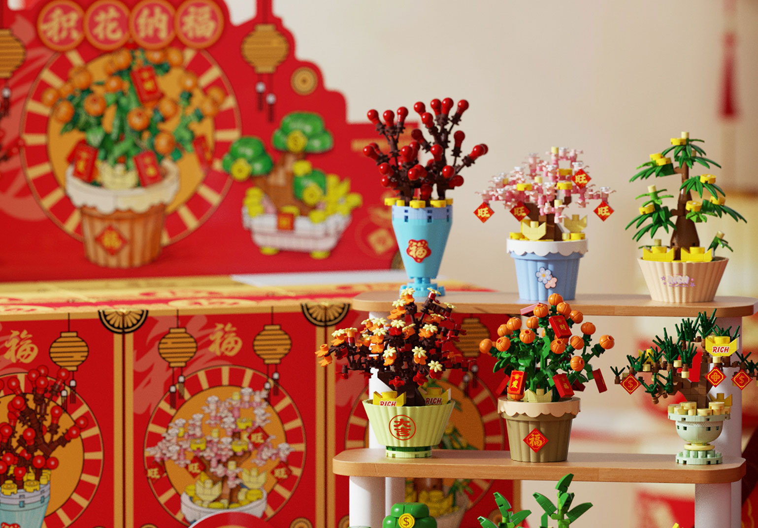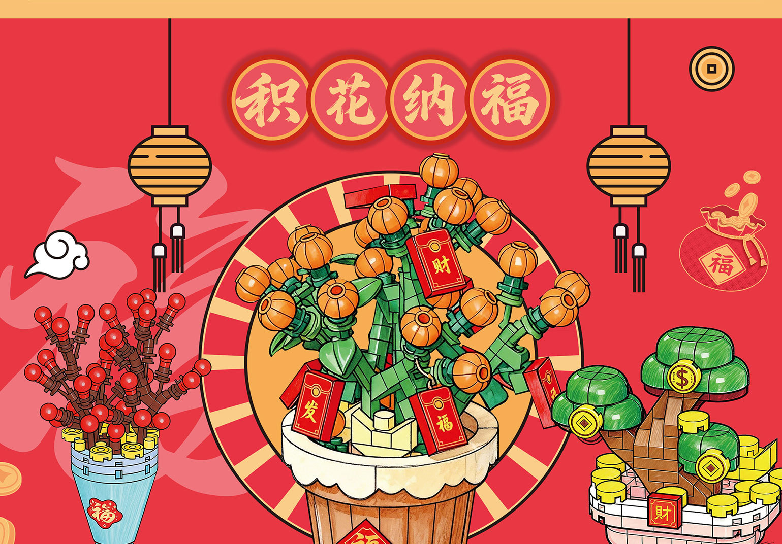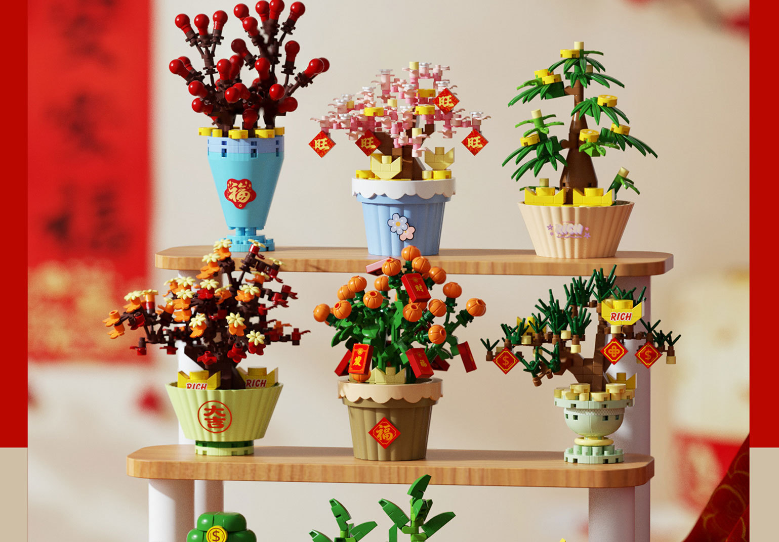 兼容乐高新年积木积花纳福永生花发财树益智拼装玩具摆件新年礼物