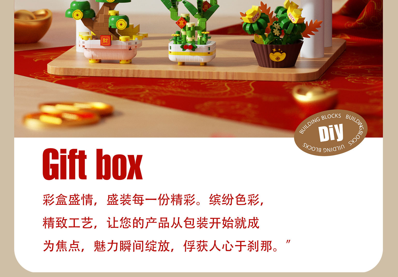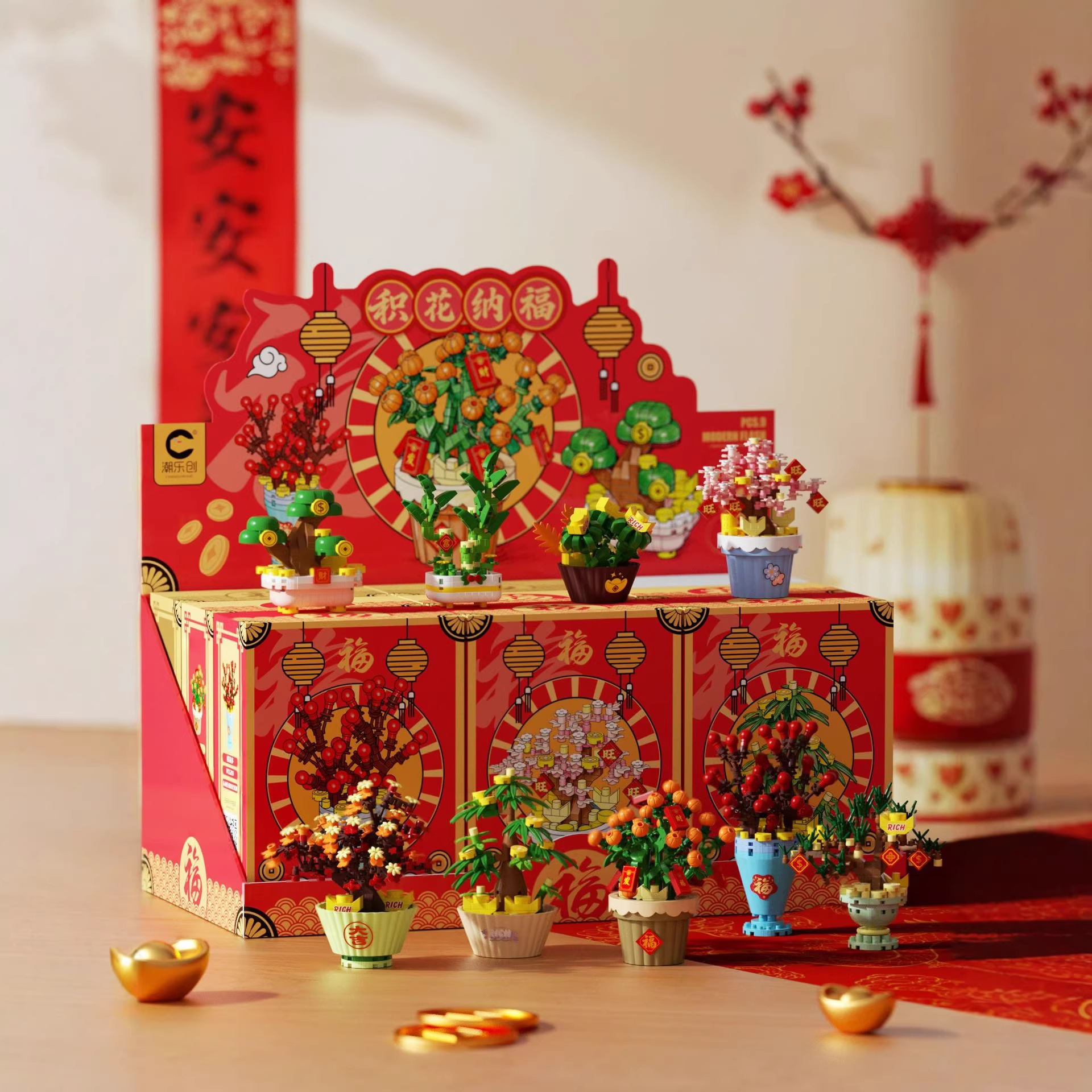潮乐创微颗粒拼装积木积花纳福发财树永生花玩具摆件新年礼物