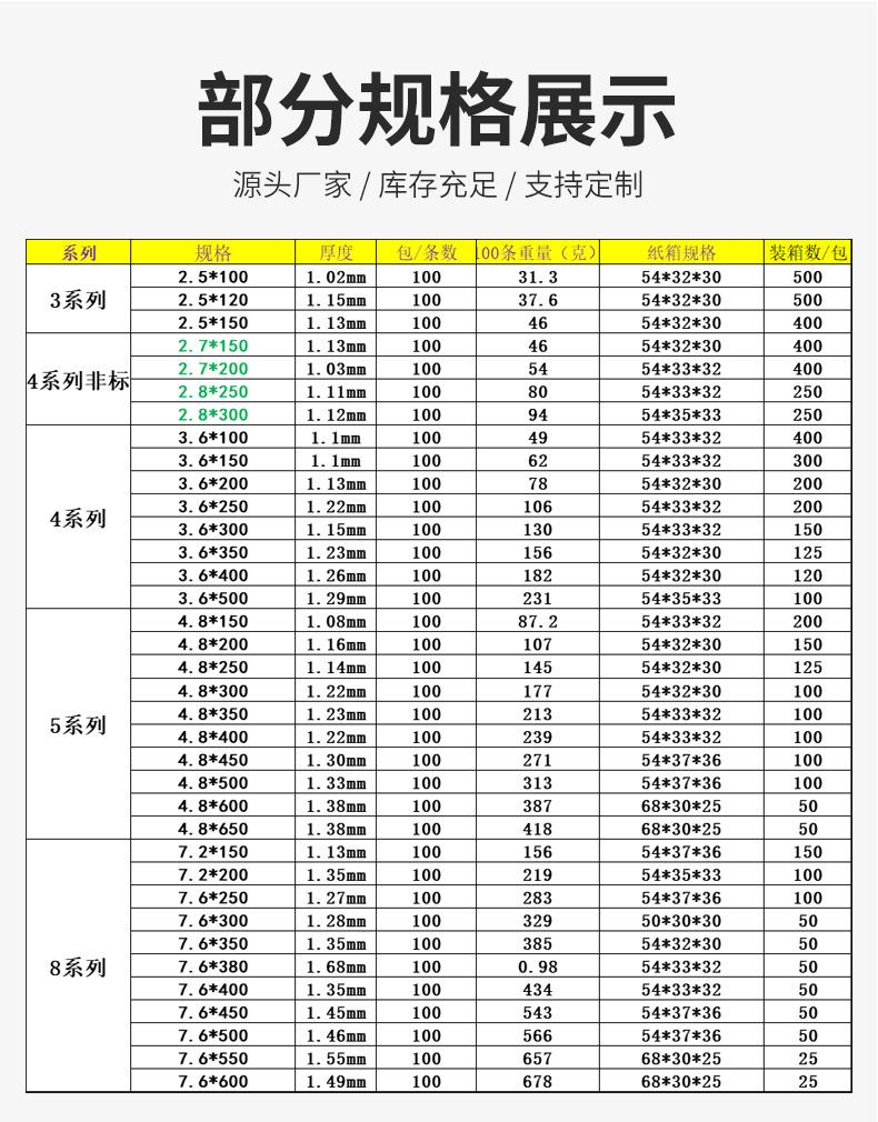 白色;国标3*100宽2.5mm 100条,白色;国标3*120宽2.5mm 100条,白色;国标3*150宽2.5mm 100条,白色;国标4*100宽3.6mm 100条,白色;国标4*150宽3.6mm 100条,白色;国标4*200宽3.6mm 100条,白色;国标4*250宽3.6mm 100条,白色;国标4*300宽3.6mm 100条,白色;国标4*350宽3.6mm 100条,白色;国标4*400宽3.6mm 100条,白色;国标4*500宽3.6mm 100条,白色;非标4*150宽2.7mm 100条,白色;非标4*200宽2.7mm 100条,白色;非标4*250宽2.8mm 100条,白色;非标4*300宽2.8mm 100条,白色;国标5*150宽4.8mm 100条,白色;国标5*200宽4.8mm 100条,白色;国标5*250宽4.8mm 100条,白色;国标5*300宽4.8mm 100条,白色;国标5*350宽4.8mm 100条,白色;国标5*400宽4.8mm 100条,白色;国标5*450宽4.8mm 100条,白色;国标5*500宽4.8mm 100条,白色;国标5*600宽4.8mm 100条,白色;国标5*650宽4.8mm 100条,白色;国标8*150宽7.2mm 100条,白色;国标8*200宽7.2mm 100条,白色;国标8*250宽7.6mm 100条,白色;国标8*300宽7.6mm 100条,白色;国标8*350宽7.6mm 100条,白色;国标8*380宽7.6mm 100条,白色;国标8*400宽7.6mm 100条,白色;国标8*450宽7.6mm 100条,白色;国标8*500宽7.6mm 100条,白色;国标8*550宽7.6mm 100条,白色;国标8*600宽7.6mm 100条,白色;国标10*300宽8.8mm 100条,白色;国标10*400宽8.8mm 100条,白色;国标10*500宽8.8mm 100条,白色;国标10*560宽8.8mm 100条,白色;国标10*600宽8.8mm 100条,白色;国标10*650宽8.8mm 100条,白色;国标10*720宽8.8mm 100条,白色;国标10*760宽8.8mm 100条,白色;国标10*800宽8.8mm 100条,白色;国标10*900宽8.8mm 100条,白色;国标10*1020宽8.8mm 100条,白色;国标10*1200宽8.8mm 100条,白色;国标10*1500宽8.8mm 50条,白色;国标12*500宽12mm 100条,黑色;国标3*100宽2.5mm 100条,黑色;国标3*120宽2.5mm 100条,黑色;国标3*150宽2.5mm 100条,黑色;国标4*100宽3.6mm 100条,黑色;国标4*150宽3.6mm 100条,黑色;国标4*200宽3.6mm 100条,黑色;国标4*250宽3.6mm 100条,黑色;国标4*300宽3.6mm 100条,黑色;国标4*350宽3.6mm 100条,黑色;国标4*400宽3.6mm 100条,黑色;国标4*500宽3.6mm 100条,黑色;非标4*150宽2.7mm 100条,黑色;非标4*200宽2.7mm 100条,黑色;非标4*250宽2.8mm 100条,黑色;非标4*300宽2.8mm 100条,黑色;国标5*150宽4.8mm 100条,黑色;国标5*200宽4.8mm 100条,黑色;国标5*250宽4.8mm 100条,黑色;国标5*300宽4.8mm 100条,黑色;国标5*350宽4.8mm 100条,黑色;国标5*400宽4.8mm 100条,黑色;国标5*450宽4.8mm 100条,黑色;国标5*500宽4.8mm 100条,黑色;国标5*600宽4.8mm 100条,黑色;国标5*650宽4.8mm 100条,黑色;国标8*150宽7.2mm 100条,黑色;国标8*200宽7.2mm 100条,黑色;国标8*250宽7.6mm 100条,黑色;国标8*300宽7.6mm 100条,黑色;国标8*350宽7.6mm 100条,黑色;国标8*380宽7.6mm 100条,黑色;国标8*400宽7.6mm 100条,黑色;国标8*450宽7.6mm 100条,黑色;国标8*500宽7.6mm 100条,黑色;国标8*550宽7.6mm 100条,黑色;国标8*600宽7.6mm 100条,黑色;国标10*300宽8.8mm 100条,黑色;国标10*400宽8.8mm 100条,黑色;国标10*500宽8.8mm 100条,黑色;国标10*560宽8.8mm 100条,黑色;国标10*600宽8.8mm 100条,黑色;国标10*650宽8.8mm 100条,黑色;国标10*720宽8.8mm 100条,黑色;国标10*760宽8.8mm 100条,黑色;国标10*800宽8.8mm 100条,黑色;国标10*900宽8.8mm 100条,黑色;国标10*1020宽8.8mm 100条,黑色;国标10*1200宽8.8mm 100条,黑色;国标10*1500宽8.8mm 50条,黑色;国标12*500宽12mm 100条