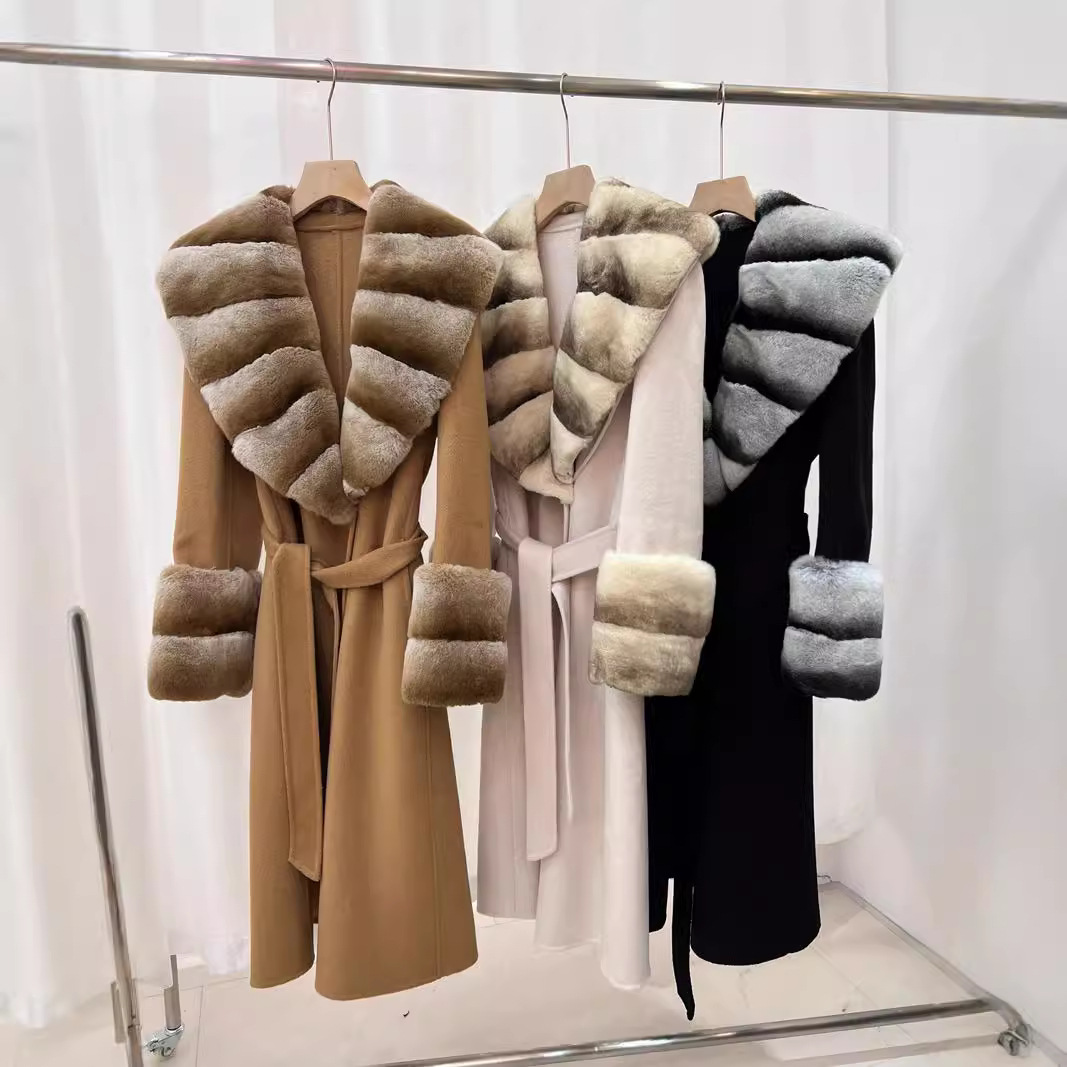 両面のカシミヤのコートの女性の高級感のミンクの毛の襟の重工の水ドリルのウールの毛皮のコートの中の長いタイプの女性