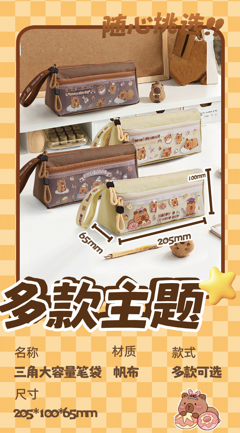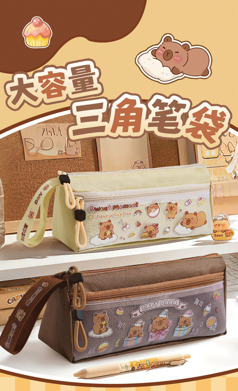 咔巴熊1102B零食卡皮巴拉三角笔袋大容量简约可爱学生文具收纳袋