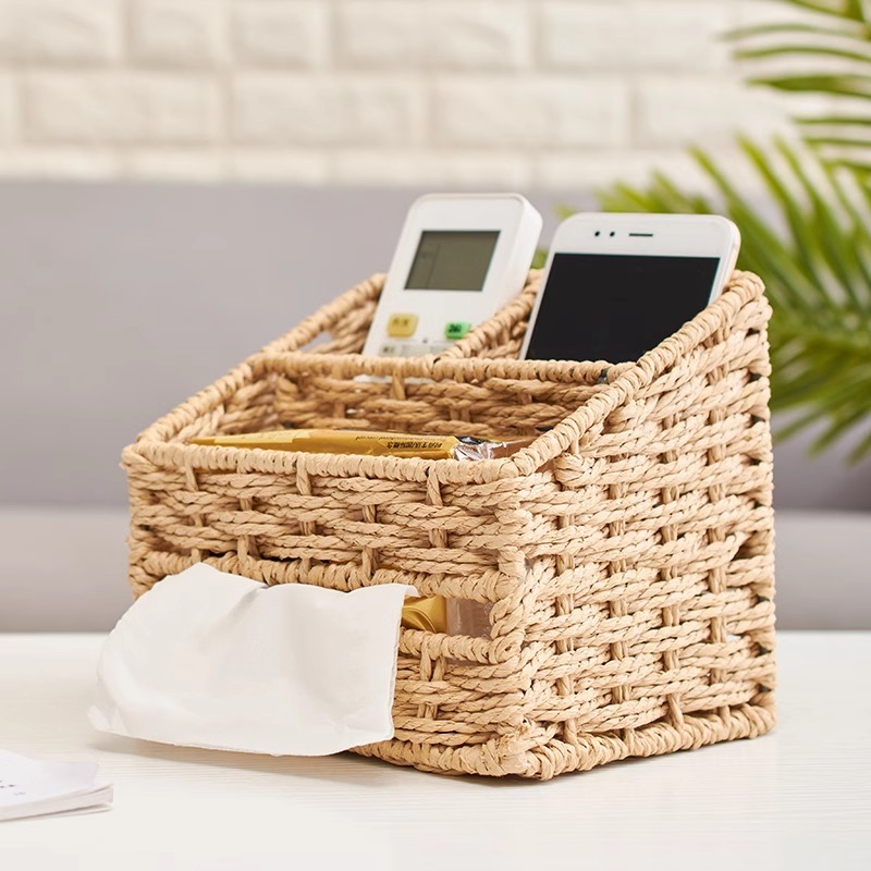 草編み多機能ティッシュボックスデスクトップキーリモコン小さい収納ボックス化粧品収納ボックス茶何雑物カゴ
