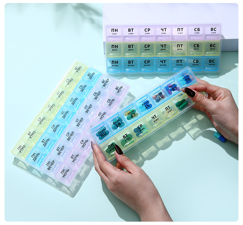 工場直販 新型 週間21グリッド ロシア語 大型3列仕切り収納ボックス カラーブロック収納 蓋付き薬箱