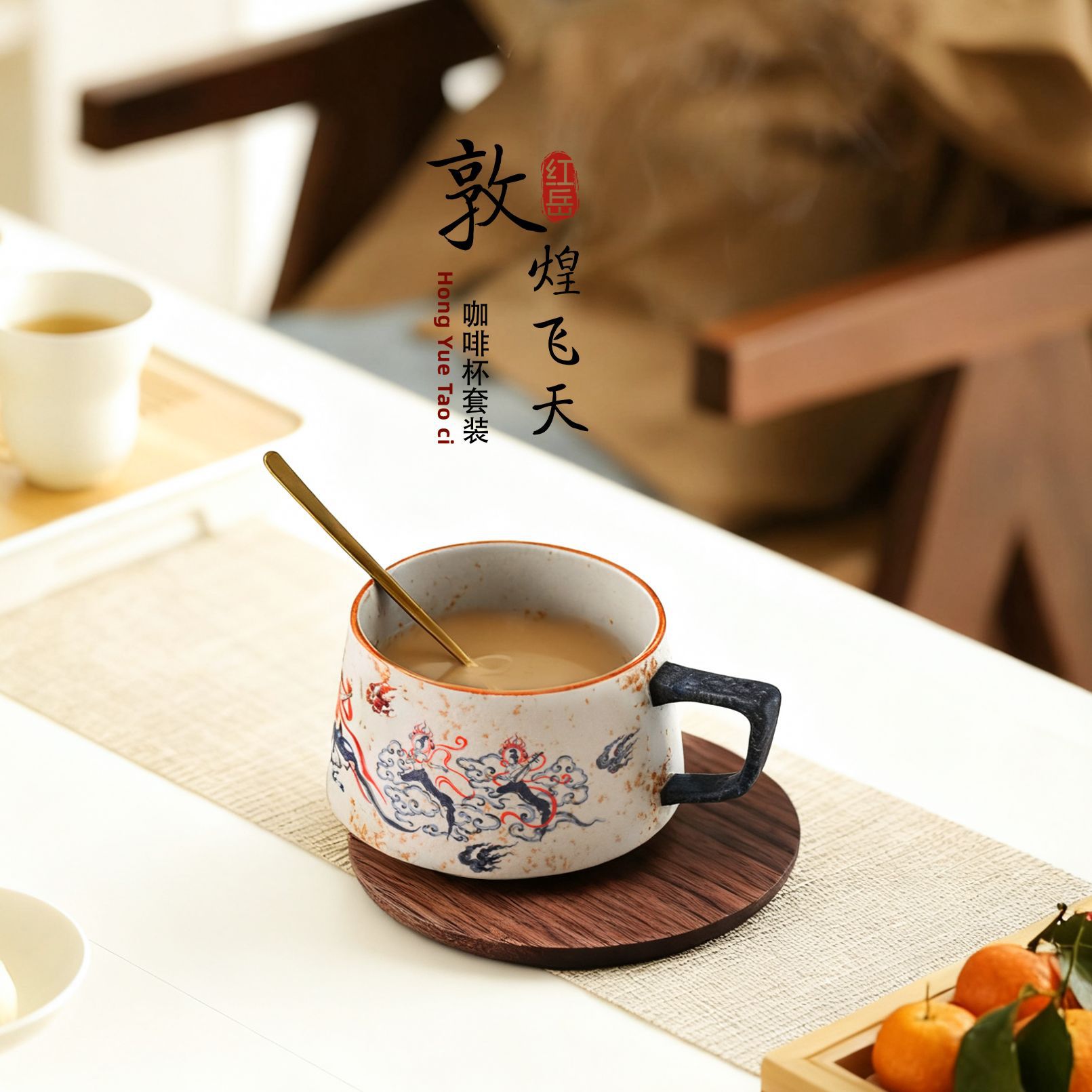 复古青花火石红飞天敦煌陶瓷咖啡杯碟拿铁拉花杯子高级感马克杯