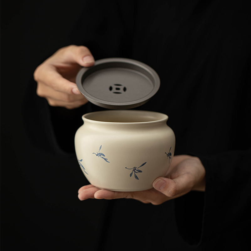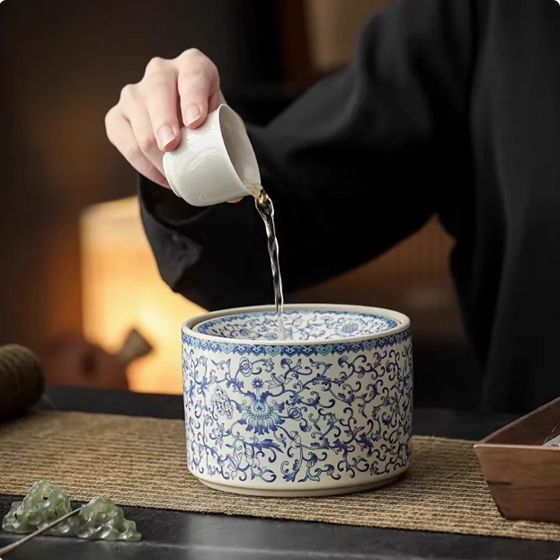 手描きの青い蓮の花建水茶洗陶磁器茶器部品茶盆茶かすかめの小型デスクトップ廃水かめ茶バケツ