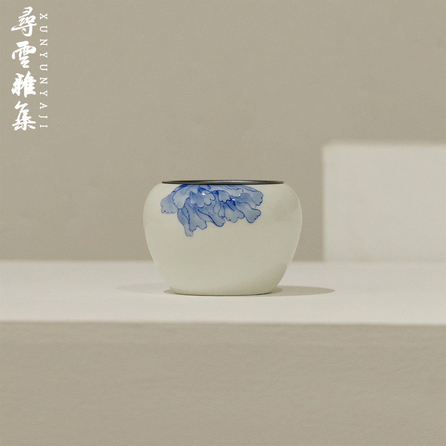 寻云雅集青花纯手绘牡丹陶瓷建水家用茶渣缸带盖中式干泡茶洗水盂