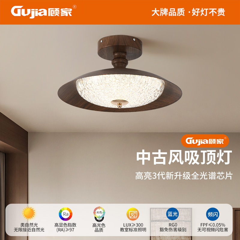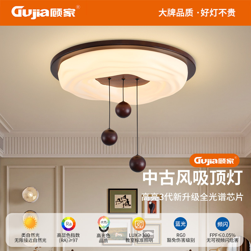 顾家新中式卧室灯护眼吸顶灯胡桃木色餐厅灯中古风主卧书房灯357L