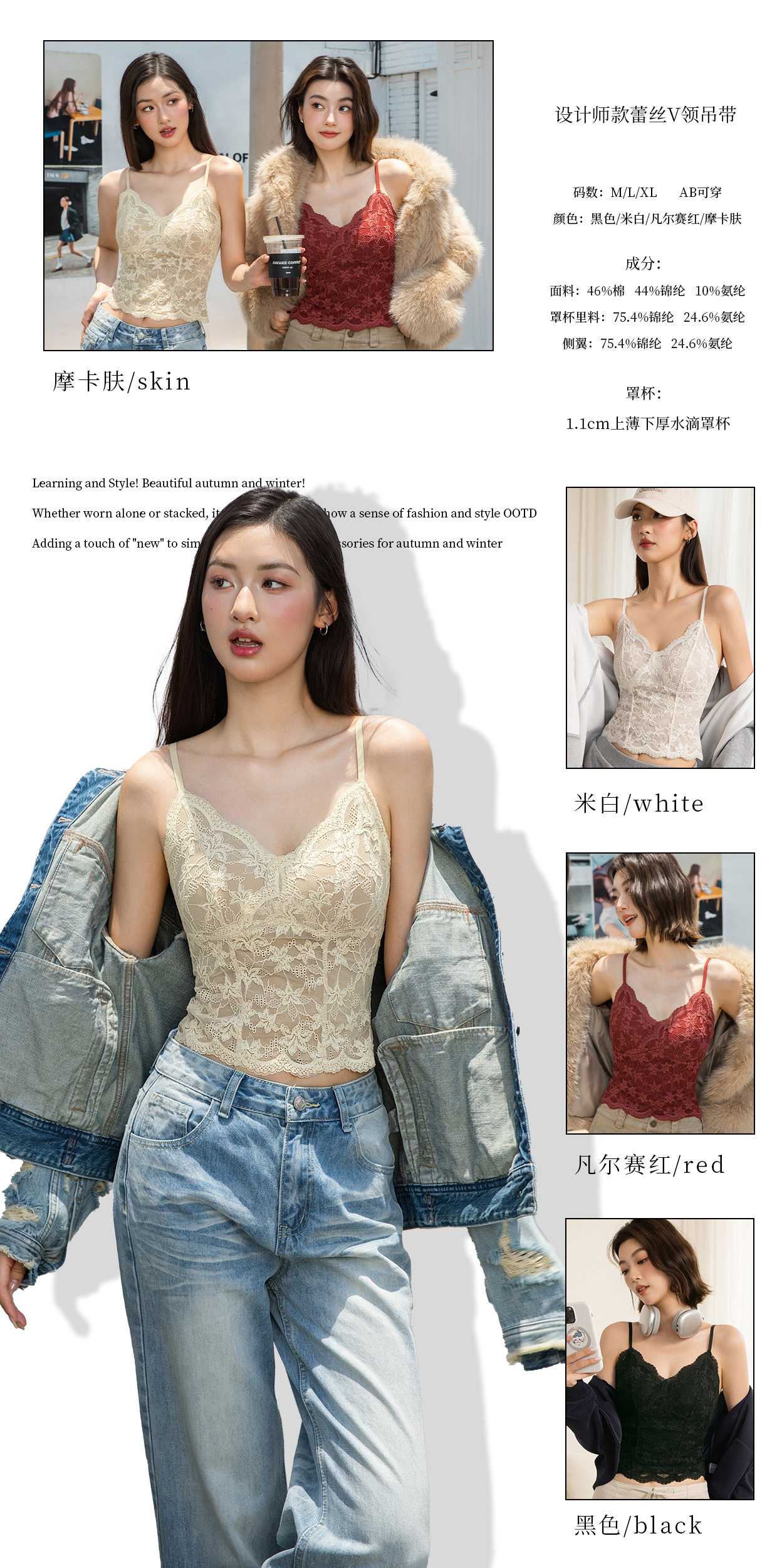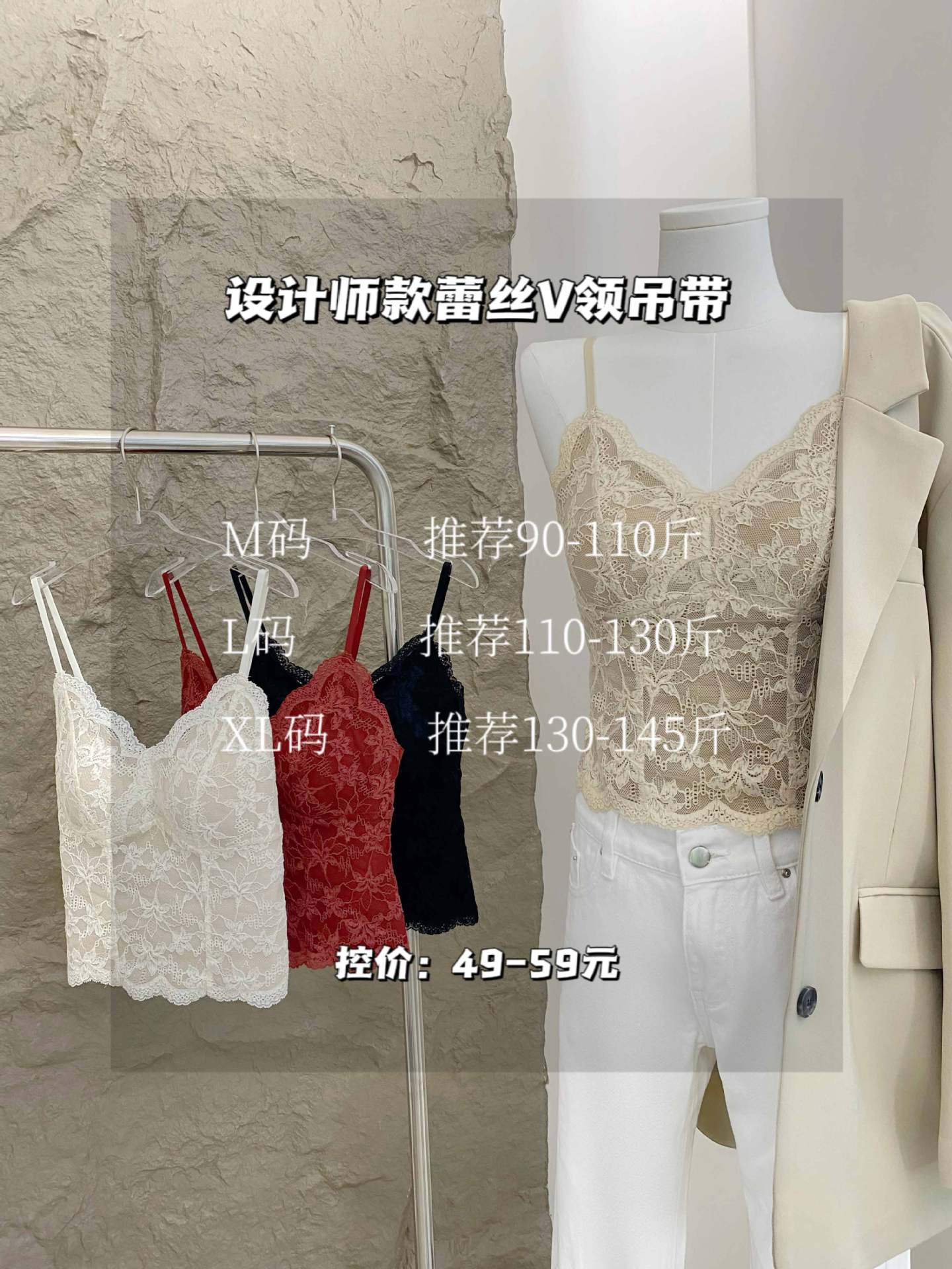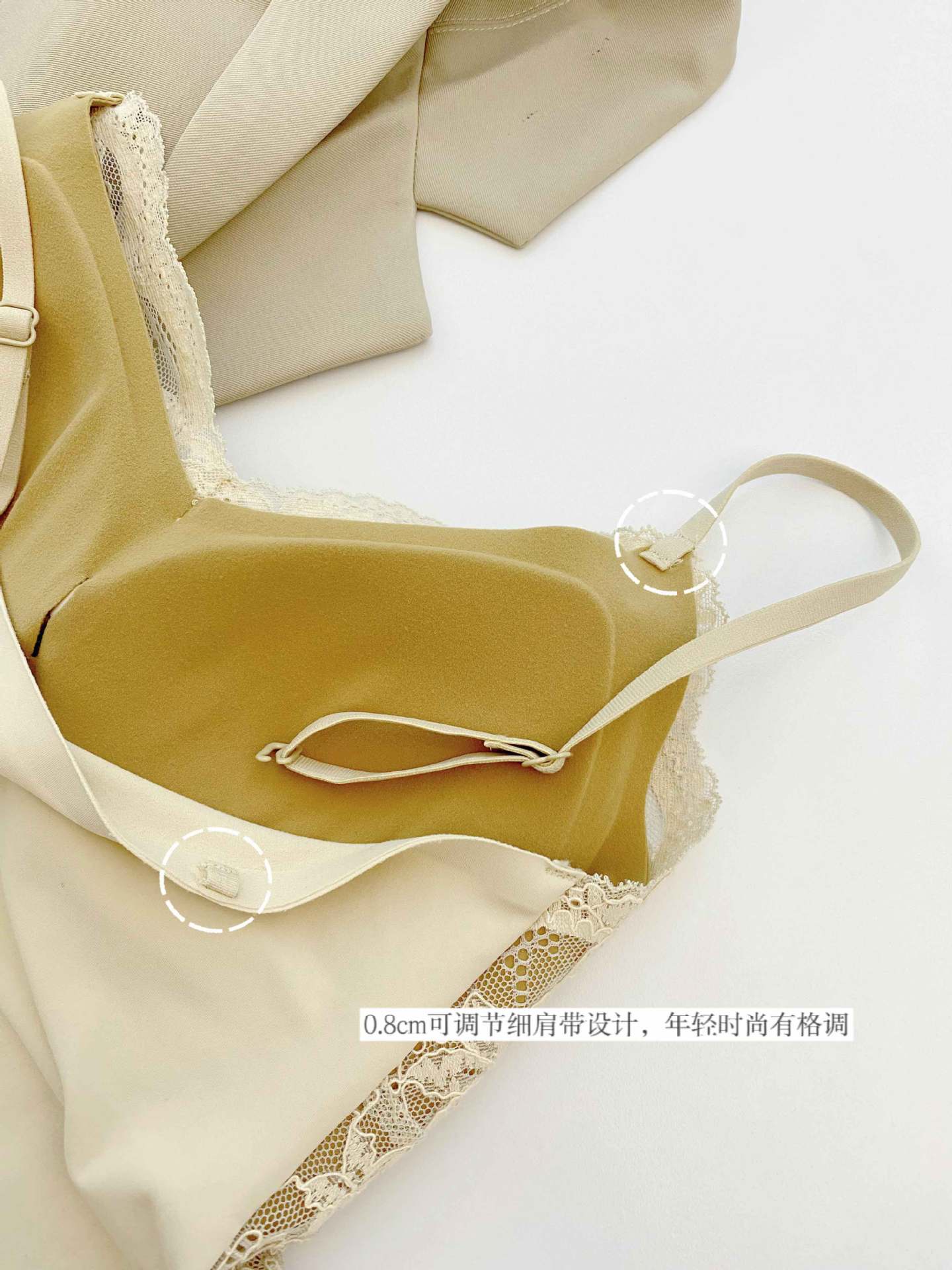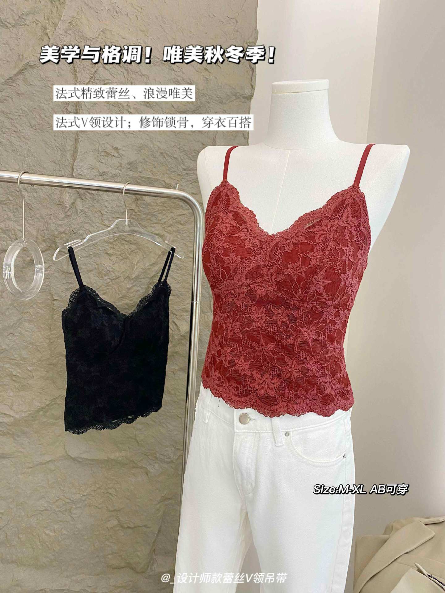 秋冬磨毛保暖纯欲法式蕾丝内搭V领带胸垫吊带美背心显瘦打底上衣
