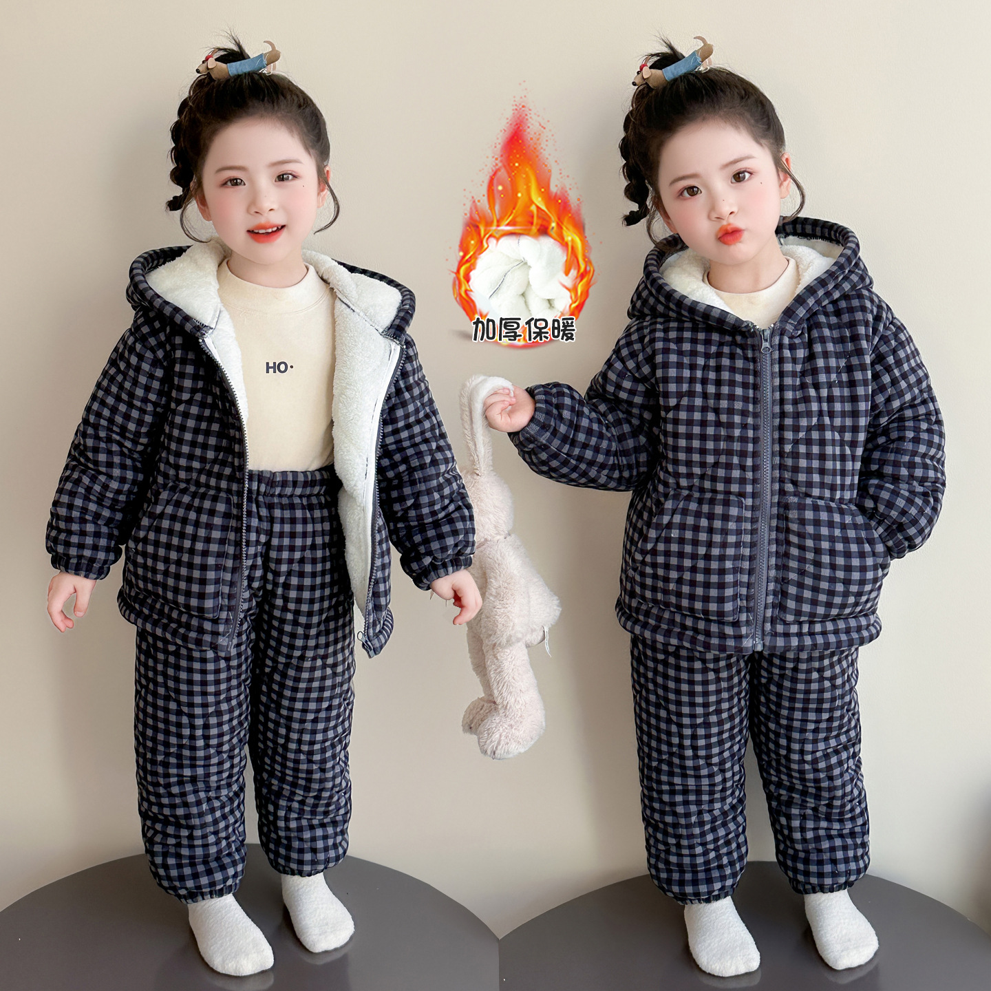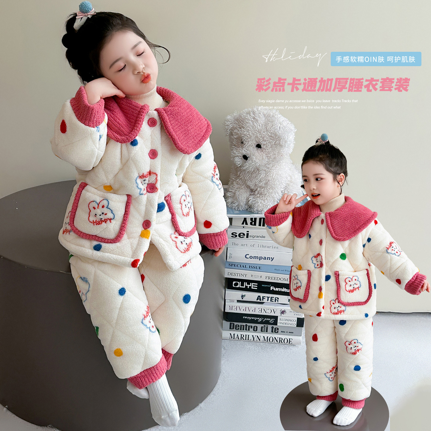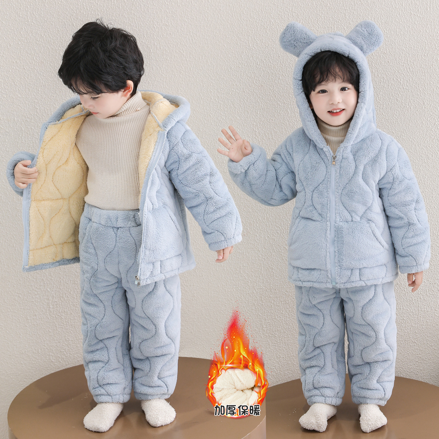 儿童家居服三层夹棉厚睡衣两件套中小童过冬保暖睡衣可爱毛绒绒套