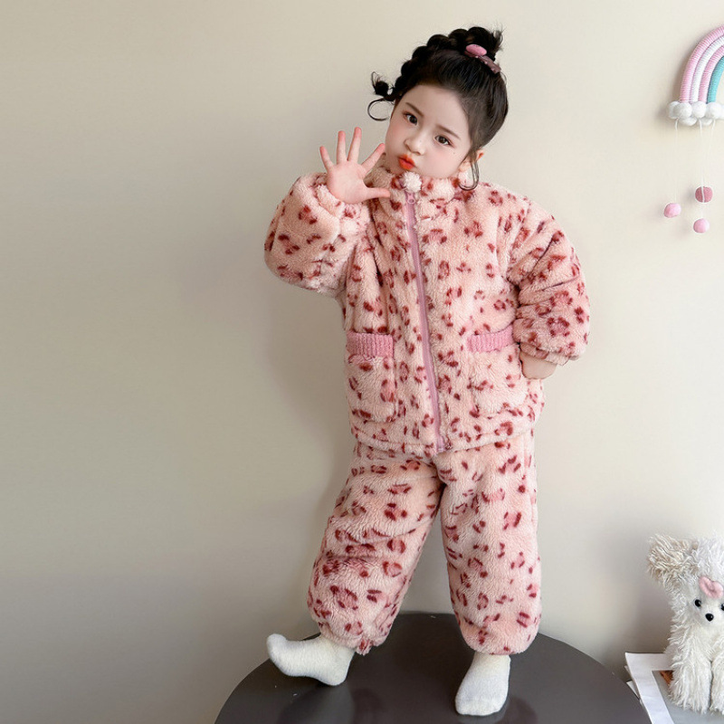 女童冬季三层加绒加厚儿童冬装帽耳豹纹毛绒家居服套装保暖睡衣潮